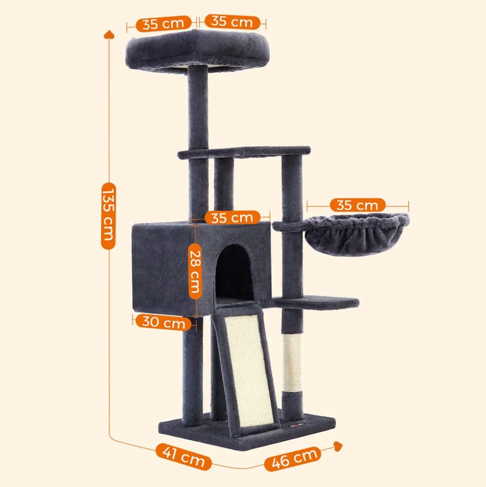 [4 niveaux de plaisirs] Grimper, dormir, se prélasser, observer… Cet arbre à chat multi-niveaux de 135 cm offre une variété d’activités pour vos chats. Avec plusieurs niveaux, c’est facile de monter et de descendre, même pour les chatons et les chats âgés[Stable, sûr, sécurisé] Fabriquée avec des panneaux d’aggloméré de qualité et équipée d’une base renforcée et sécurisée par un kit anti-basculement, cette tour de jeux est stable, sûre et sécurisée, idéale pour 3 chats (7 kg chacun)[Housse amovible, nettoyage facile] La plate-forme du haut est dotée d’une housse amovible et lavable (conseil : lavage à la main). C’est si facile de garder la niche de vos amis félins propre[Confort] Cet arbre à chat est recouvert de tissu peluche tout doux pour que vos chats s’y sentent à l’aise. La plate-forme rembourrée, la niche et le panier offrent encore plus de confort. Idéal pour ronronner, faire la sieste et prendre le soleil[Protégez votre canapé] Avec 1 griffoir et 1 planche à griffer 2-en-1, vos chats peuvent faire leurs griffes à leur guise et laisser votre canapé tranquille !