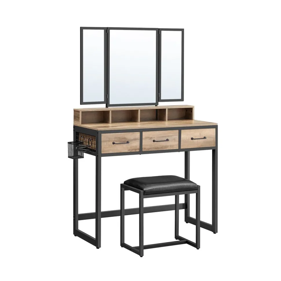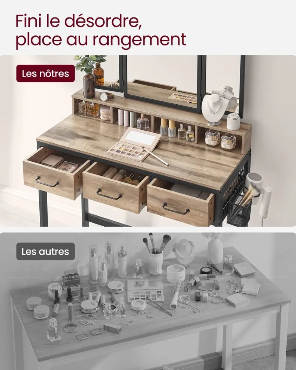 Mise en beauté simplifiée : Un miroir intégré et une planche rabattable servent de mini coiffeuse. Maquillez-vous et mettez vos accessoires sans fermer la porte du meuble