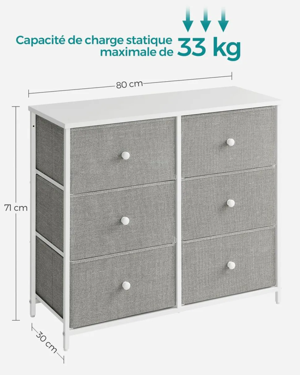 [Bye bye le chaos !] Si vous continuez à perdre du terrain dans la bataille contre les pyjamas, les couvertures et les affaires éparpillées partout, voici du renfort : cette commode à 6 tiroirs en tissu spacieuse qui vous aidera à ranger votre maison[Charmante, quelque soit l’endroit] Le mélange de couleur grise claire et blanche donne vie à un style charmant. Qu’en est-il des détails ? Les poignées en bois sont la cerise sur le gâteau ![Matériaux sélectionnés] Tissu, métal et bois d’ingénierie : Ce trio de choc travaille main dans la main pour vous offrir une commode stable et durable tout en légèreté prête à supporter votre collection de vêtements grandissante[Esprit tranquille] Pas doué pour l’assemblage ? Pas de panique ! Des instructions illustrées, des pièces numérotées et une clé Allen sont fournis pour vous simplifier le montage. Un kit anti-basculement est également fourni pour plus de sécurité[Ce que vous obtenez] Une commode de style industriel avec 6 grands tiroirs en tissu. Ajoutez de l’espace de rangement dans le couloir et dans la chambre tout en montant que vous avez bon goût !