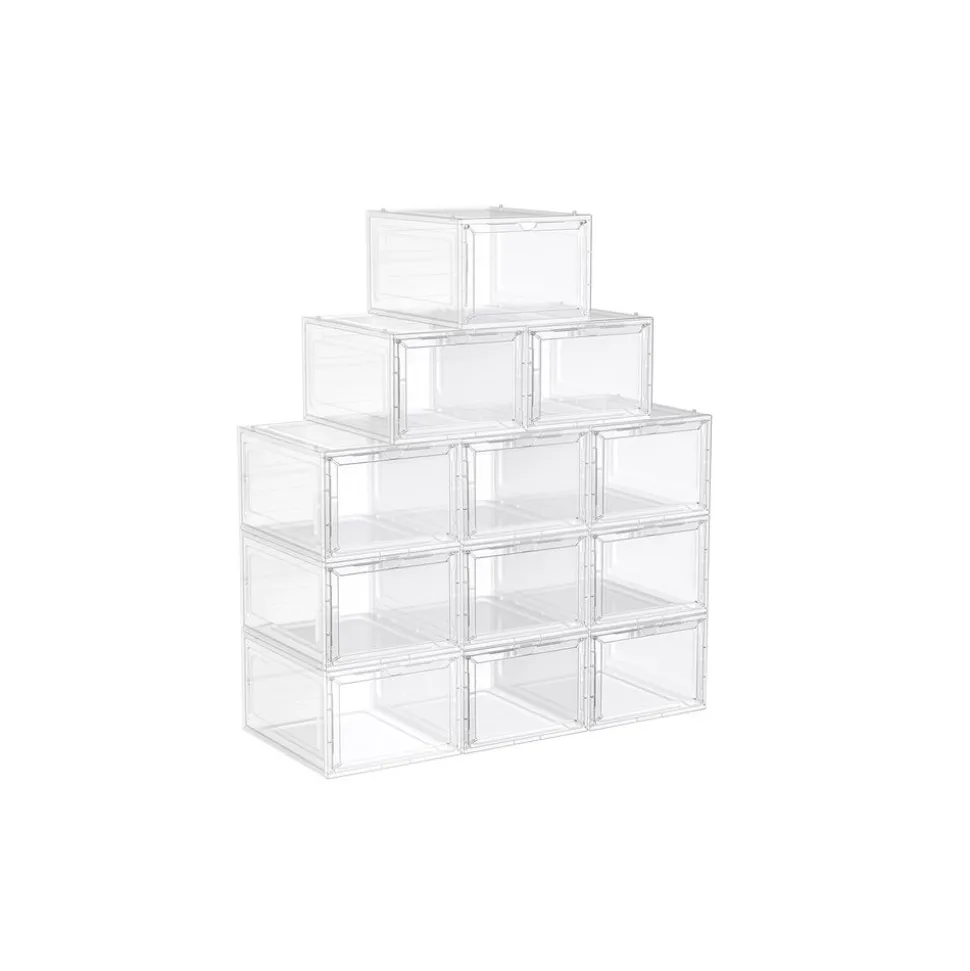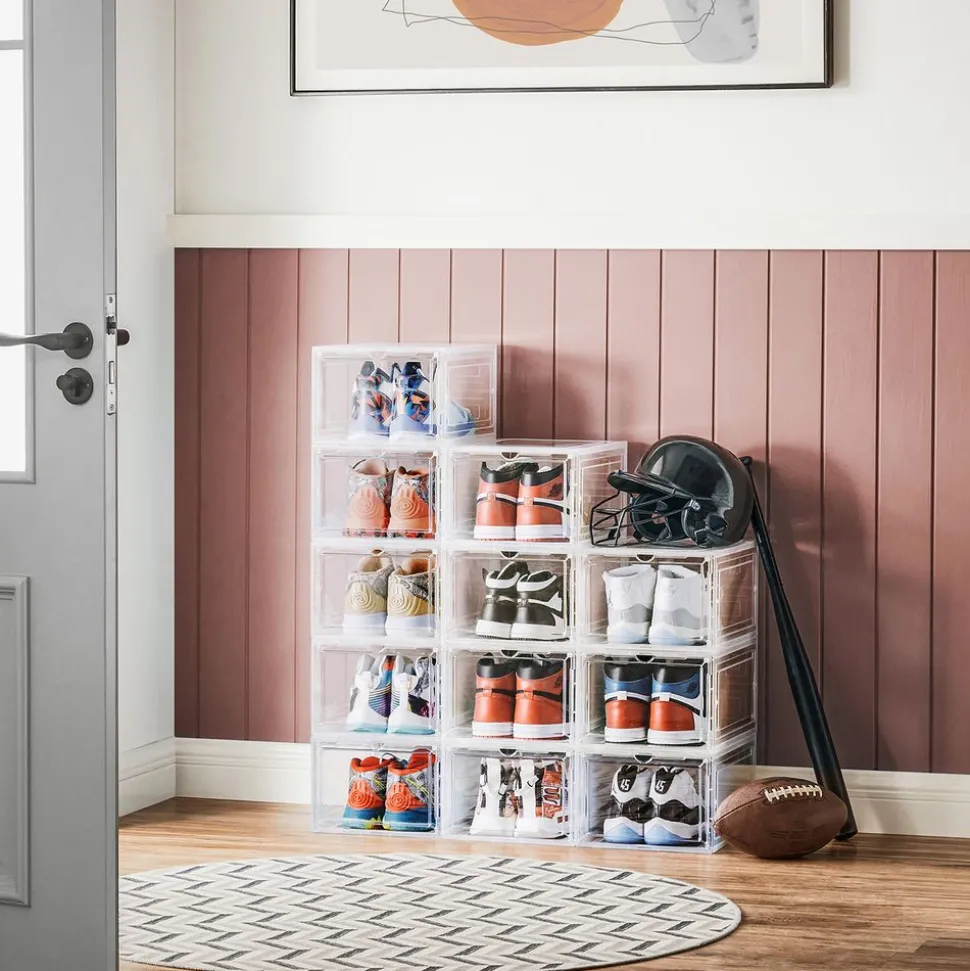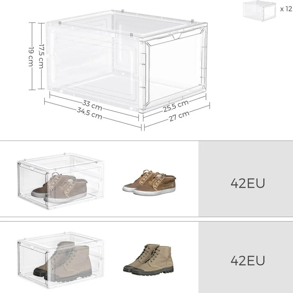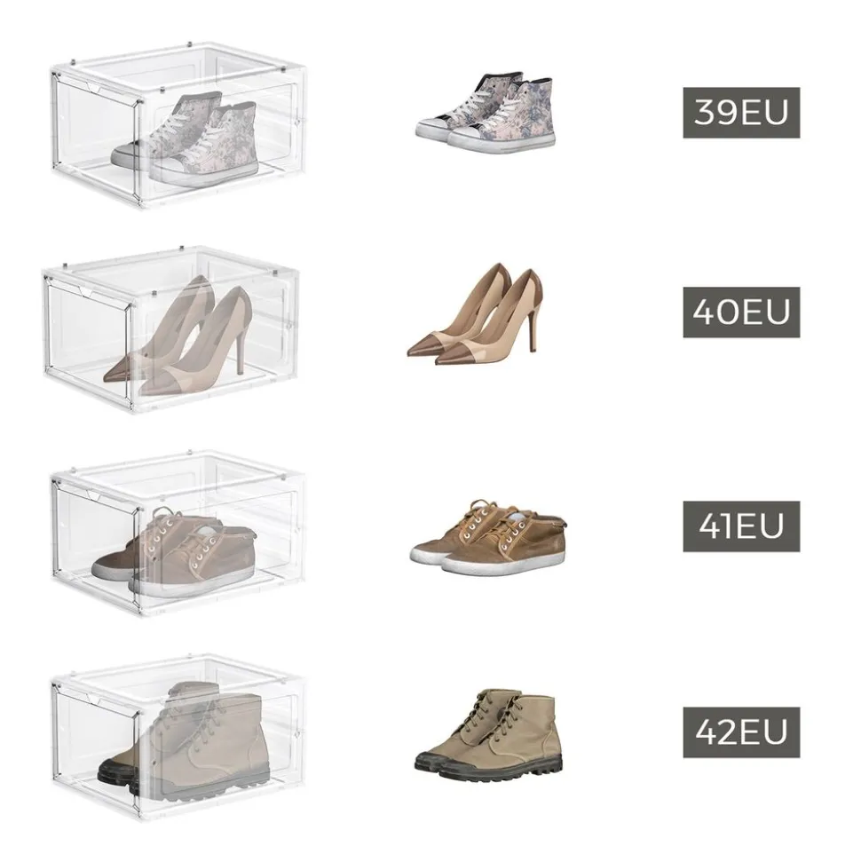 Fabriquées en plastique robuste, ces boîtes à chaussures sont durables et protègent vos chaussures de la poussière et de l’humidité. En plus, grâce aux embouts en plastique, elles peuvent être parfaitement empilés ou reliés entre eux pour créer un porte-chaussures peu encombrant.Jusqu’à la pointure 46
