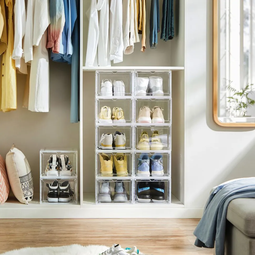 Les boîtes à chaussures empilables en plastique SONGMICS (pointure jusqu’au 46) vous aident à organiser vos chaussures pour les retrouver en un coup d’œil.
