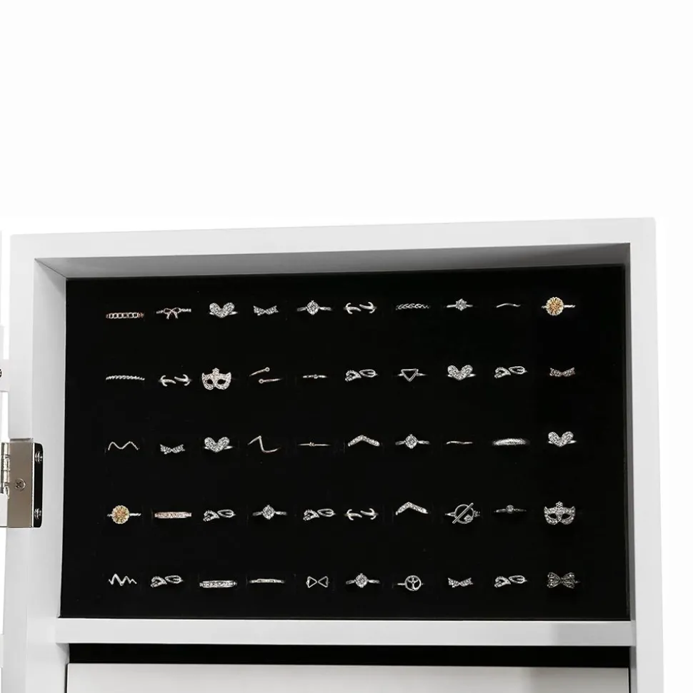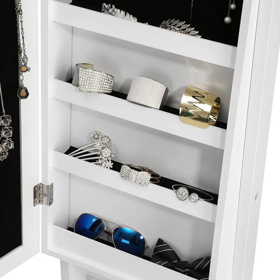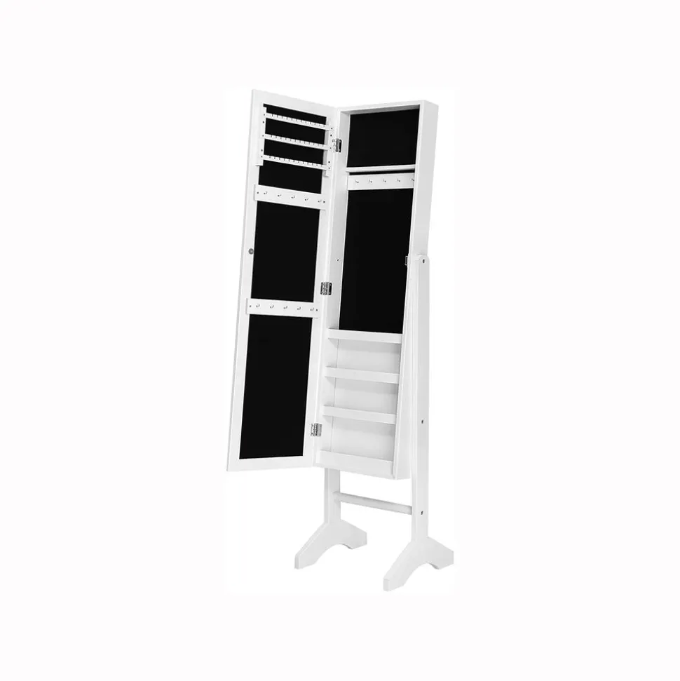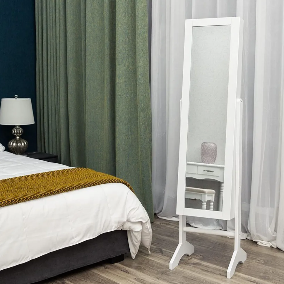 Cette armoire à bijoux avec miroir est un produit idéal et sécurisé pour ranger tous vos bijoux et accessoires de beauté. Très élégante avec sa couleur, l’armoire sera parfaite dans une chambre, le dressing, les boudoirs, les garde robes ou les couloirs. Elle dispose de crochets et de petites étagères pour contenir toute votre collections de bijoux, de lunettes, etc. Vous aurez aussi de la place pour ranger vos plus beaux foulards et écharpes. L’armoire peut pivoter en arrière pour avoir une meilleur vision de tous vos bijoux.