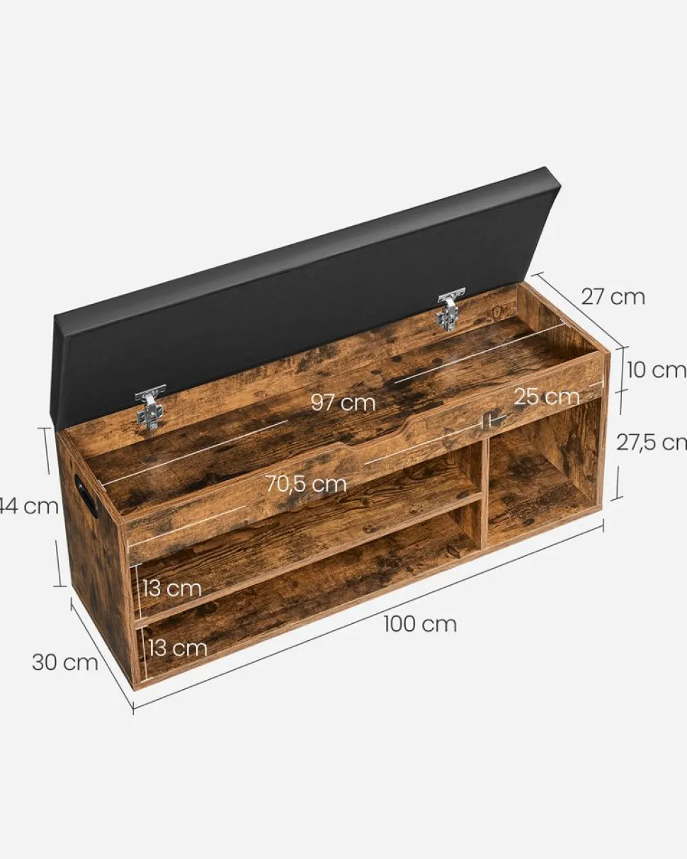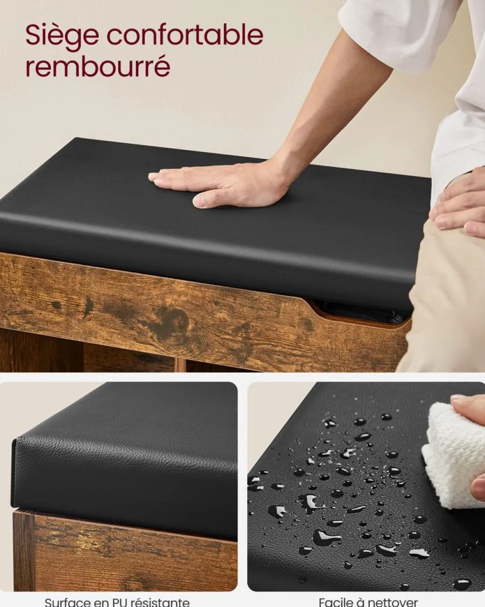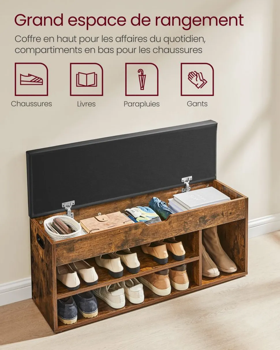 [Polyvalent] Aménagez votre intérieur avec ce banc à chaussures ! Idéal pour les dortoirs, les appartements, les entrées ou les chambres, ce banc de rangement se marie avec votre décoration, il vous permet de garder votre maison organisée et accueillante[Grande capacité] Ce banc, qui mesure 30 x 100 x 44 cm (P x L x H), comporte un coffre de 7 cm de hauteur sous le siège, offrant de la place pour vos gants, vos livres… Les compartiments ouverts peuvent accueillir 8 paires de chaussures ou vos affaires de sport[Robuste et durable] Fabriqué en panneaux d’aggloméré de qualité de 15 mm d’épaisseur, ce banc d’entrée a une capacité de charge de 150 kg. Ce banc ne vacille pas et ne fait pas de bruits, il vous accompagnera pour des années à venir[Siège confortable] Ce meuble d’entrée est doté d’un coussin en mousse de 4 cm d’épaisseur recouvert de PU, il est durable et facile à nettoyer, c’est un endroit confortable pour s’asseoir, changer de chaussures ou se reposer[Détails bien pensés] Pour vous faciliter la vie, ce banc est équipé de 2 charnières en alliage robuste qui assurent la stabilité et empêchent la fermeture inopinée du couvercle. Avec les 2 poignées latérales, c’est facile et pratique de le changer de place