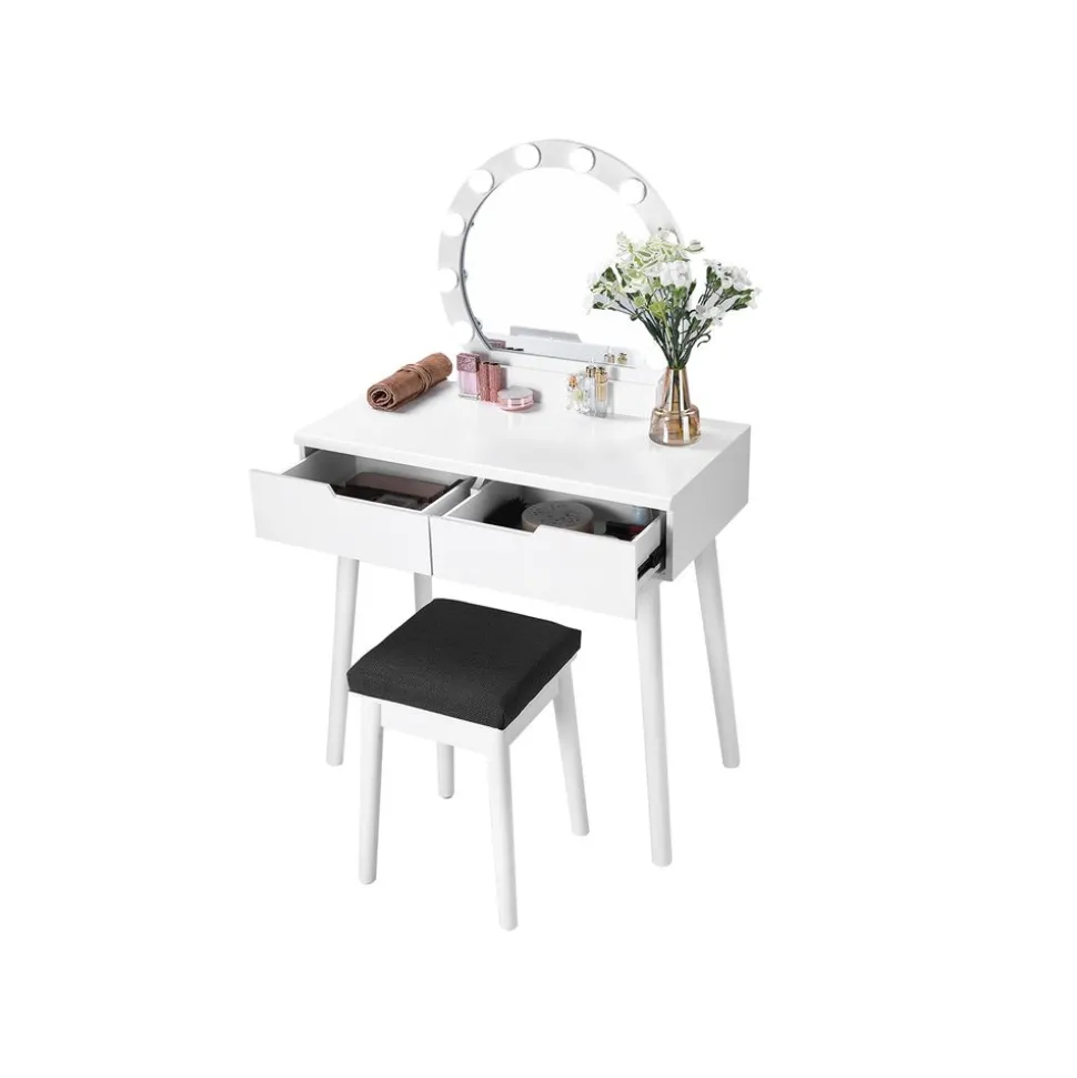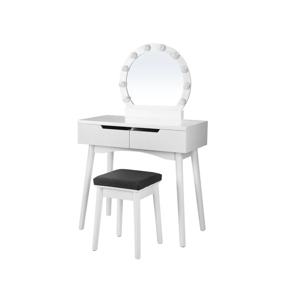 CE QUE VOUS RECEVEZ : Une coiffeuse avecdes tiroirs préassemblés, un miroir rond, 10 ampoules et une ampoule de secours, un tabouret rembourré avec housse, un sachet d’accessoires ainsi qu’un mode d’emploi illustré.[Précaution] Pour des raisons de sécurité, veuillez impérativement fixer le produit au mur avec le dispositif anti-basculement fourni