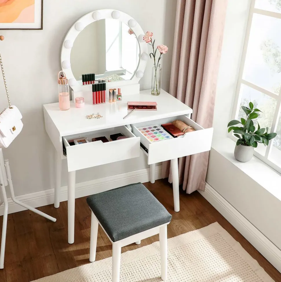 VOLUMINEUX ESPACE DE RANGEMENT : On a tous un grand nombre de produits de beauté. Dotée d’une large tablette et de 2 tiroirs profonds et spacieux avec rails coulissants, cette coiffeuse facilite le rangement des bijoux, des boîtes, et plus encore.