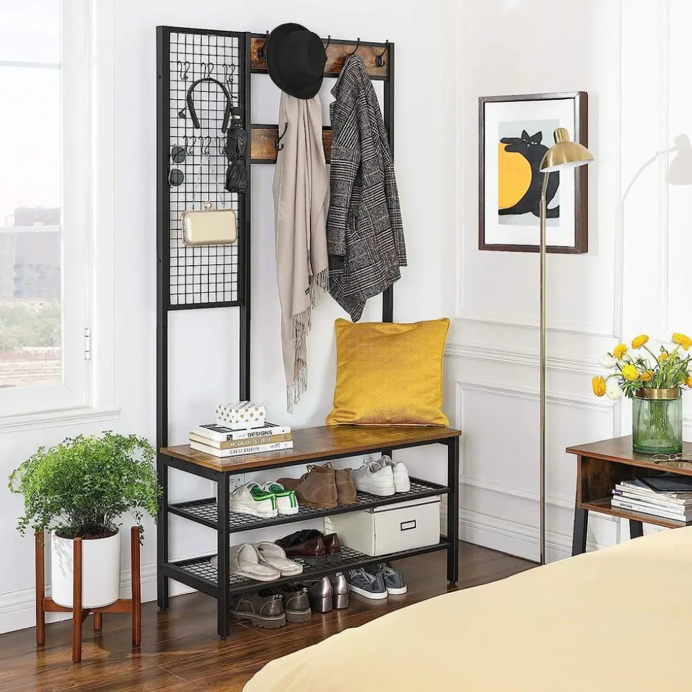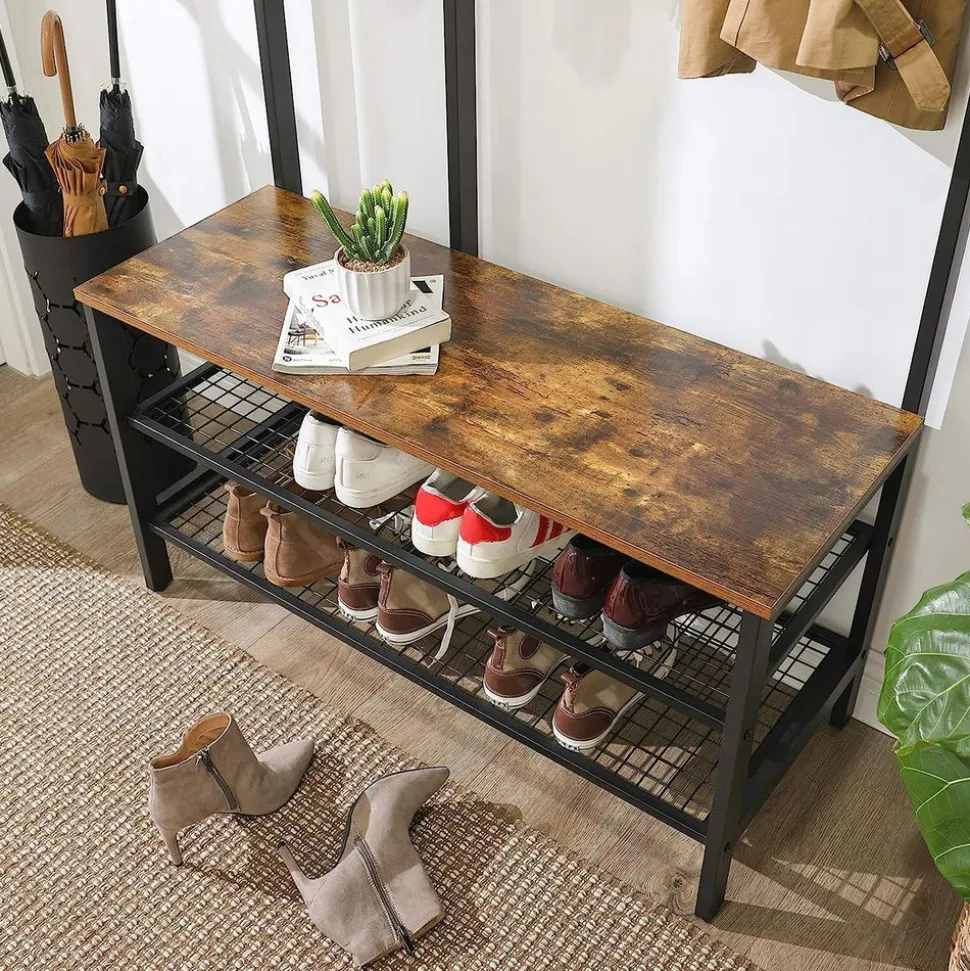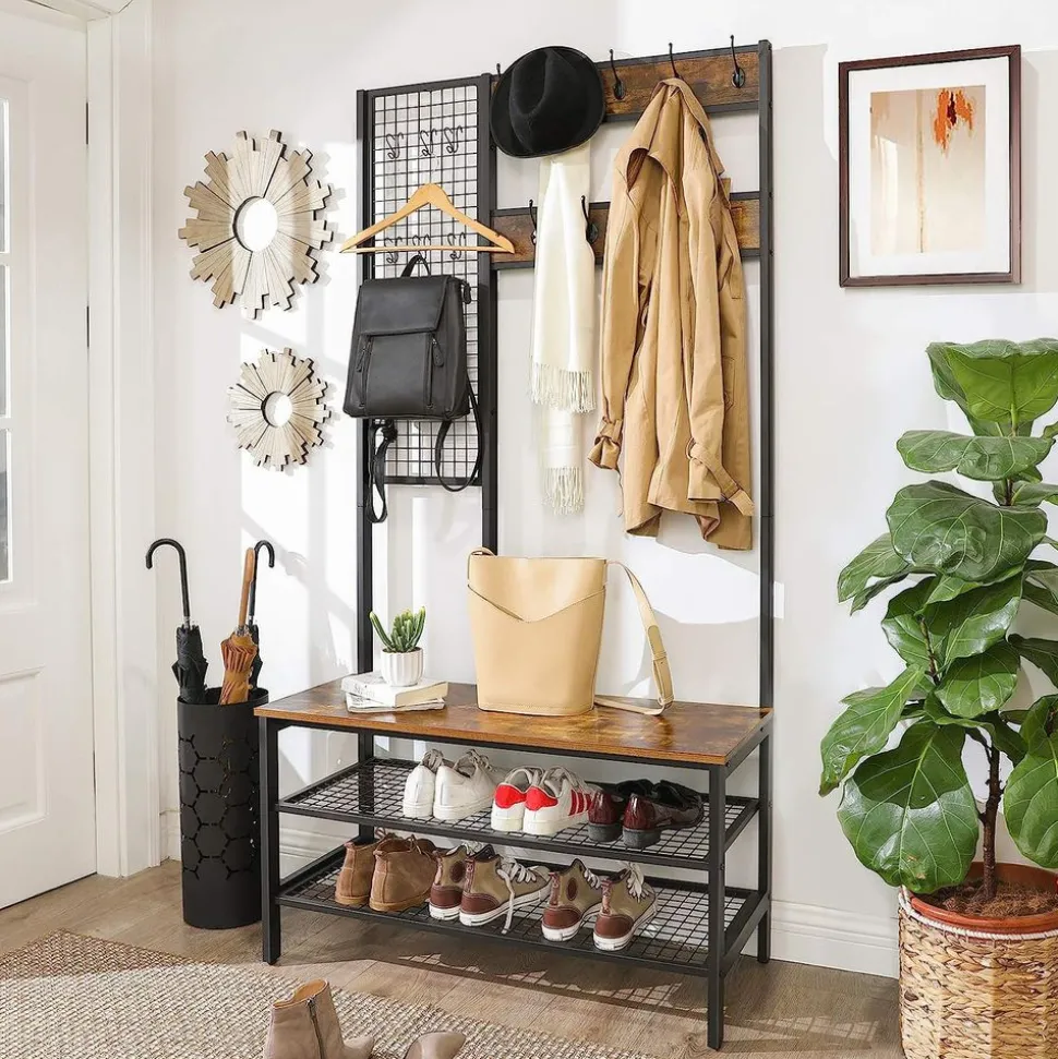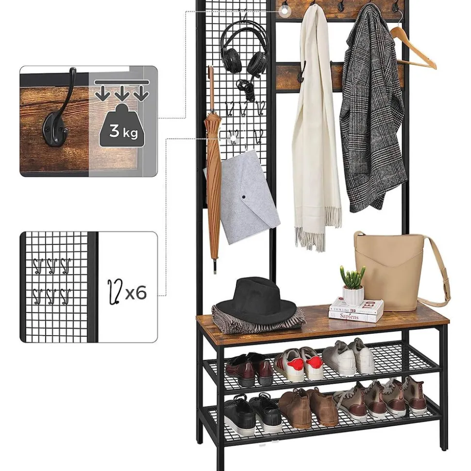 – Couleur : Brun rustique– Matériaux : Panneau d’aggloméré, fer– Dimensions : 97,7 x 40 x 185 cm (L x l x H)– Poids : 17,6 kg– Capacité de charge statique max. du crochet : 3 kg– Capacité de charge statique max. du banc : 100 kg– Capacité de charge statique max. de l’étagère en maille : 20 kg/niveauLivraison :– 1 x Portemanteau– 1 x Kit de montage (avec clé Allen)– 1 x Kit anti-basculement– 1 x Mode d’emploi (FR, DE, EN, ES, IT)Précautions de VASAGLE :– Il est interdit aux enfants de monter sur le produit et de jouer avec.– La capacité de charge statique maximale du banc est de 100 kg. Veuillez ne pas dépasser cette limite.– Pour des raisons de sécurité, veuillez fixer le produit au mur avec le dispositif anti-basculement fourni.