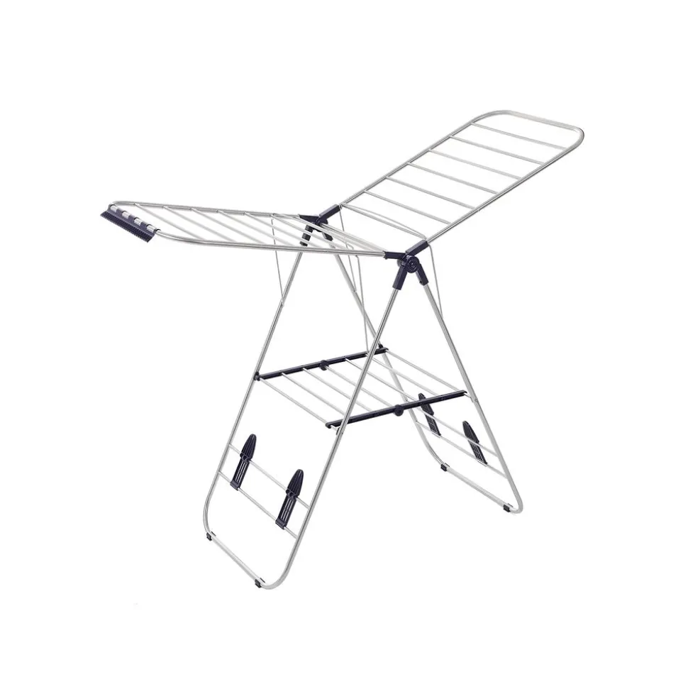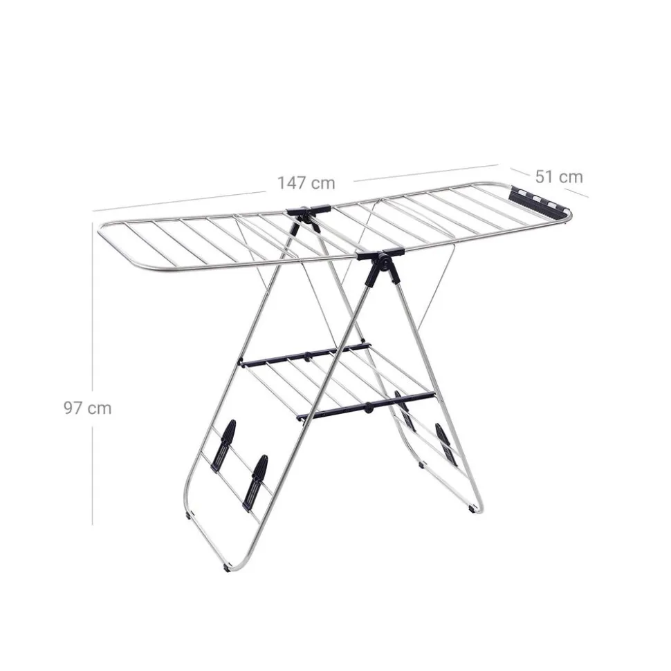 Grande charge – Les dimensions du produit déplié est de 147 x 56 x 128 cm (L x l x H), équivalentes à une corde à linge de 16 m; la surface à étendre le linge est suffisante pour 2 machines. A l’aide des deux bras wings, vous pouvez étendre des vêtements, même des couvertures. La charge maximale est de 15 kg