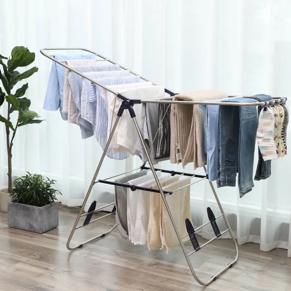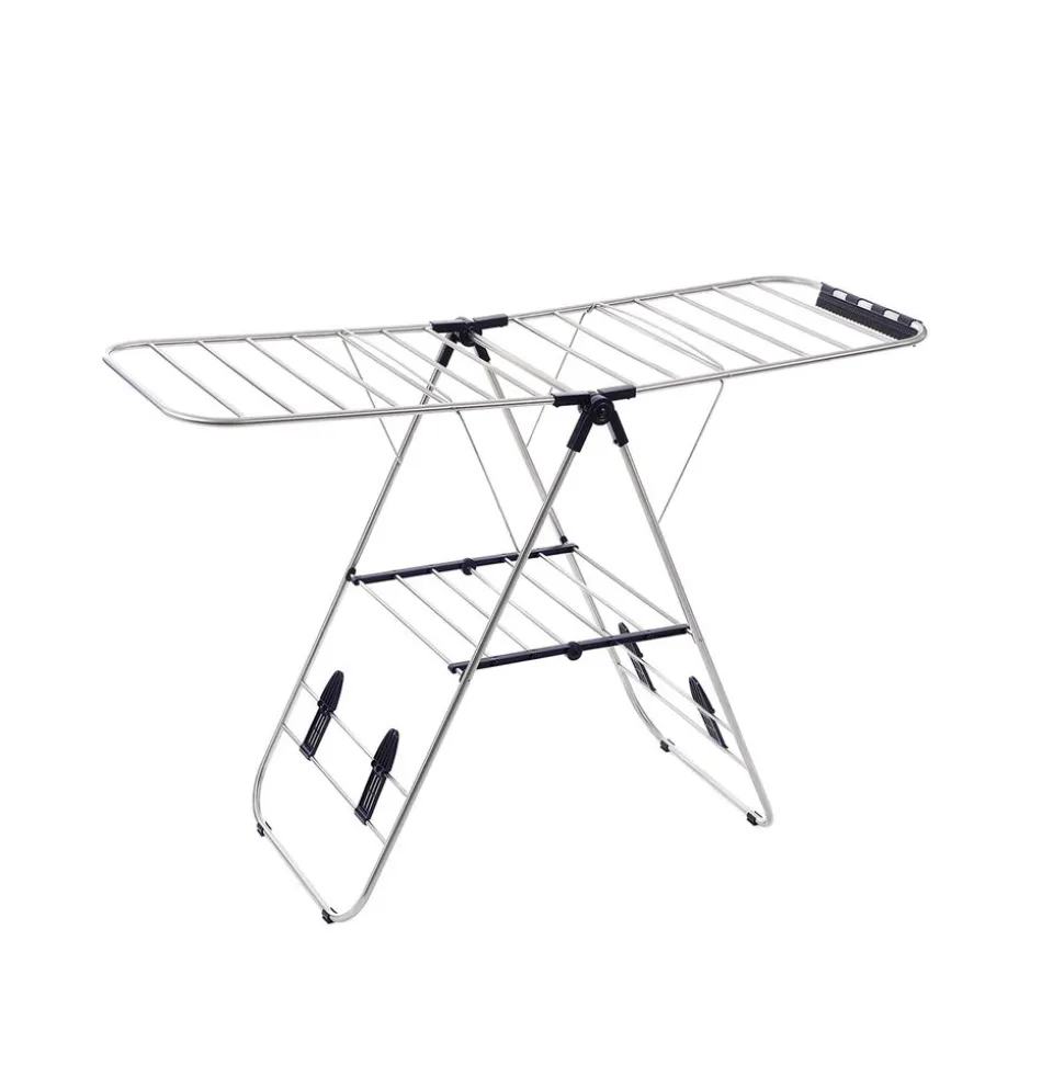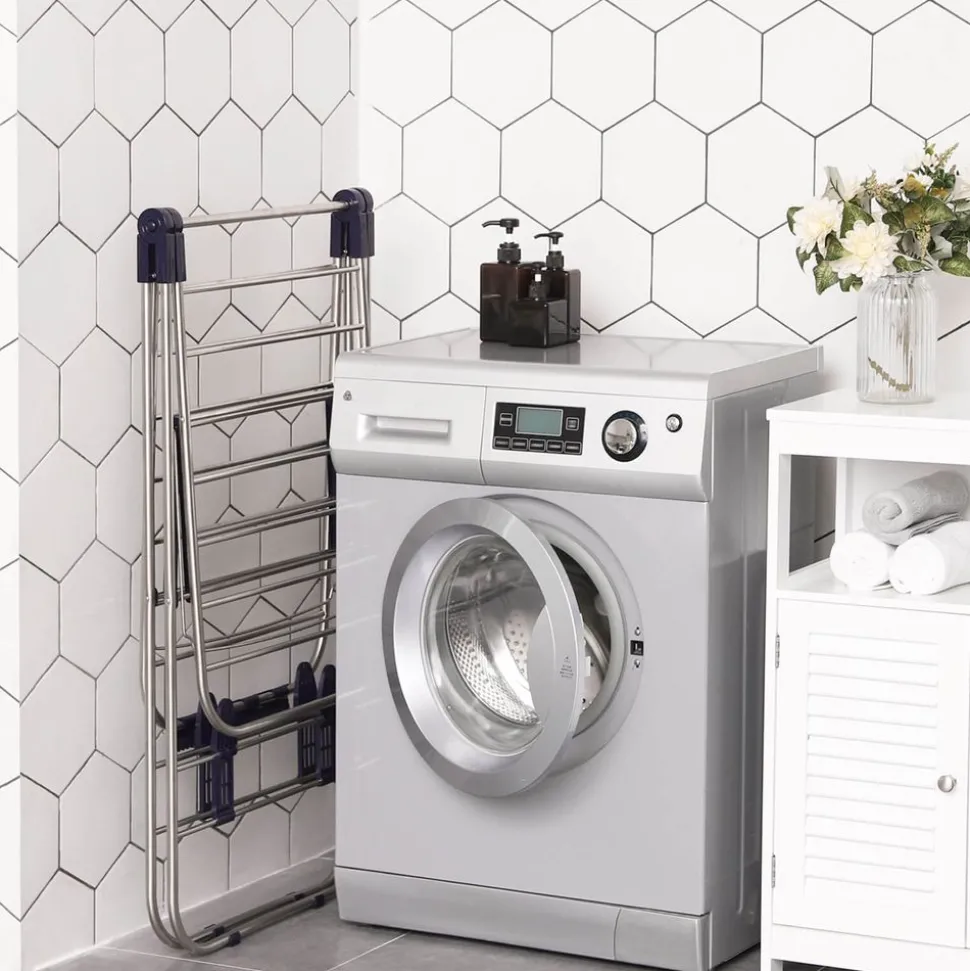 Utilisation facile, pas de montage – En cas de non utilisation, vous pouvez plier le séchoir à linge pour gagner de la place, les dimensions pliées du produit sont de 107 x 56 x 7 cm (L x l x H)