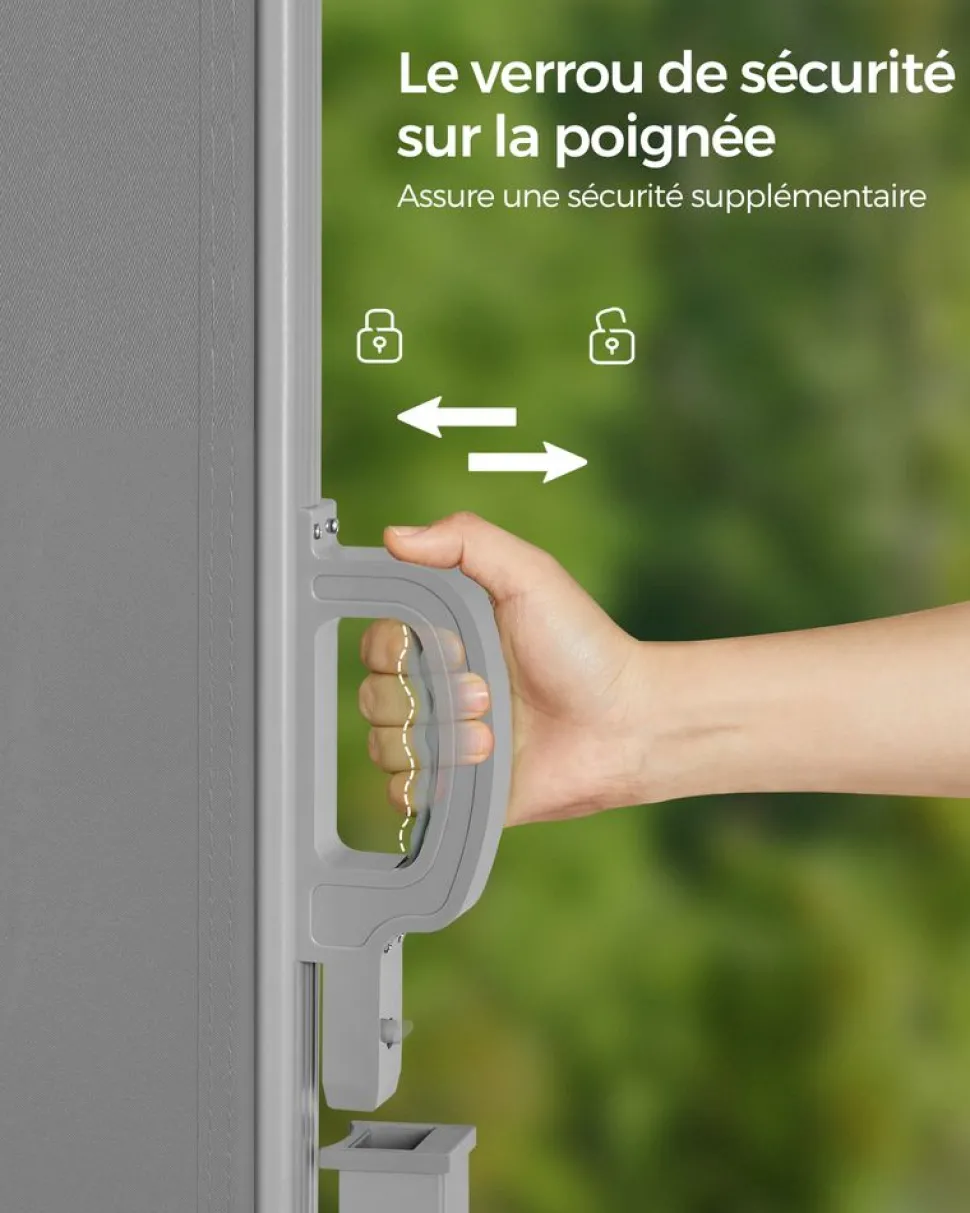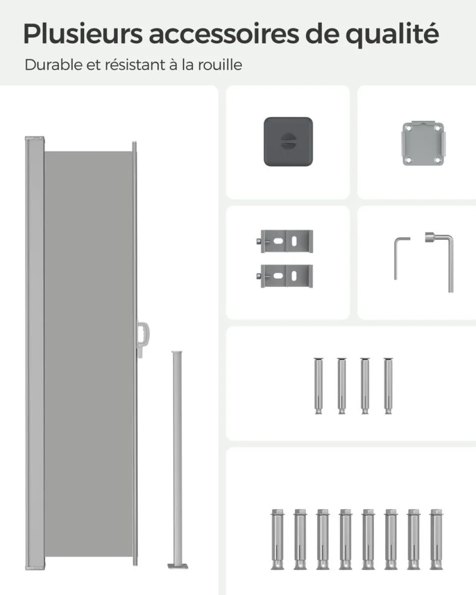 - Est-il possible d’enlever un auvent double-face après l’installation sur le sol dur ? C’est réalisable avec ce socle SONGMICS. Il suffit de glisser la cassette du store. Le store latéral est prêt à vous protéger des rayons forts du soleil et des regards indiscrets des voisins.