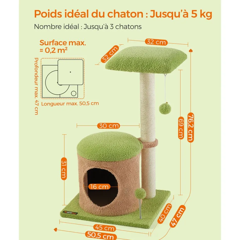 [Décore votre maison] Inspiré des cabanes dans les arbres, conçu dans un vert printemps et un marron terre clair, ce joli arbre à chat offre une niche à votre animal et apporte une touche de nature à votre intérieur[Doux comme un nuage] La surface est recouverte de tissu polaire doux, le toit et la plate-forme sont rembourrés d’une mousse de 4 cm d’épaisseur, cet arbre à chat permet à vos chatons de se détendre dans le confort d’un nid douillet[Griffoir de 69 cm] Le poteau est entièrement enveloppé de sisal pour que vos chatons puissent faire leurs griffes, s’étirer et rester en bonne santé. En plus, il préserve votre canapé des coups de griffes ![2 pompons, deux fois plus de plaisir] Un pompon à ressort se balance d’un côté à l’autre pour stimuler l’instinct de chasseur de votre chat. Un pompon suspendu avec un grelot vient amuser vos chatons quand ils sont sur la plate-forme (un pompon de rechange sans grelot est inclus)[Stable et sûr pour jouer] Une base de 45 x 40 cm assure une bonne stabilité et le kit anti-basculement permet de fixer ce petit arbre à chat au mur, afin que vos amis félins puissent monter et descendre, gratter, observer et jouer en toute sécurité