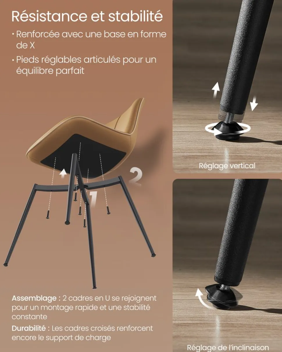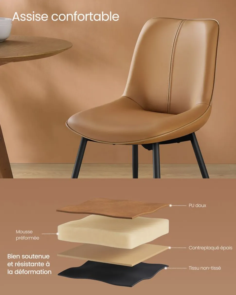 [Simple et élégante] La chaise de salle à manger présente des lignes simples et des coins arrondis. Grâce à son design classique, elle s’adapte facilement à différents styles de décoration et suscite l’admiration de vos invités[Stabilité renforcée] Les pieds en acier de la chaise de cuisine s’inclinent légèrement vers l’extérieur, formant une structure stable, pour une sécurité d’utilisation accrue[Confort exceptionnel] Avec un revêtement en PU et un rembourrage en mousse, cette chaise de cuisine offre une assise exceptionnellement confortable grâce à sa douceur au toucher[Pieds réglables, stables et protecteurs] Les pieds réglables maintiennent la stabilité de la chaise de cuisine même sur des sols légèrement irréguliers, tout en protégeant le sol d’éventuelles rayures[Conception ergonomique] La courbure ergonomique du dossier est conçue pour s’adapter scientifiquement au corps et répartir le poids de manière uniforme, améliorant le confort pendant les longues postures assises