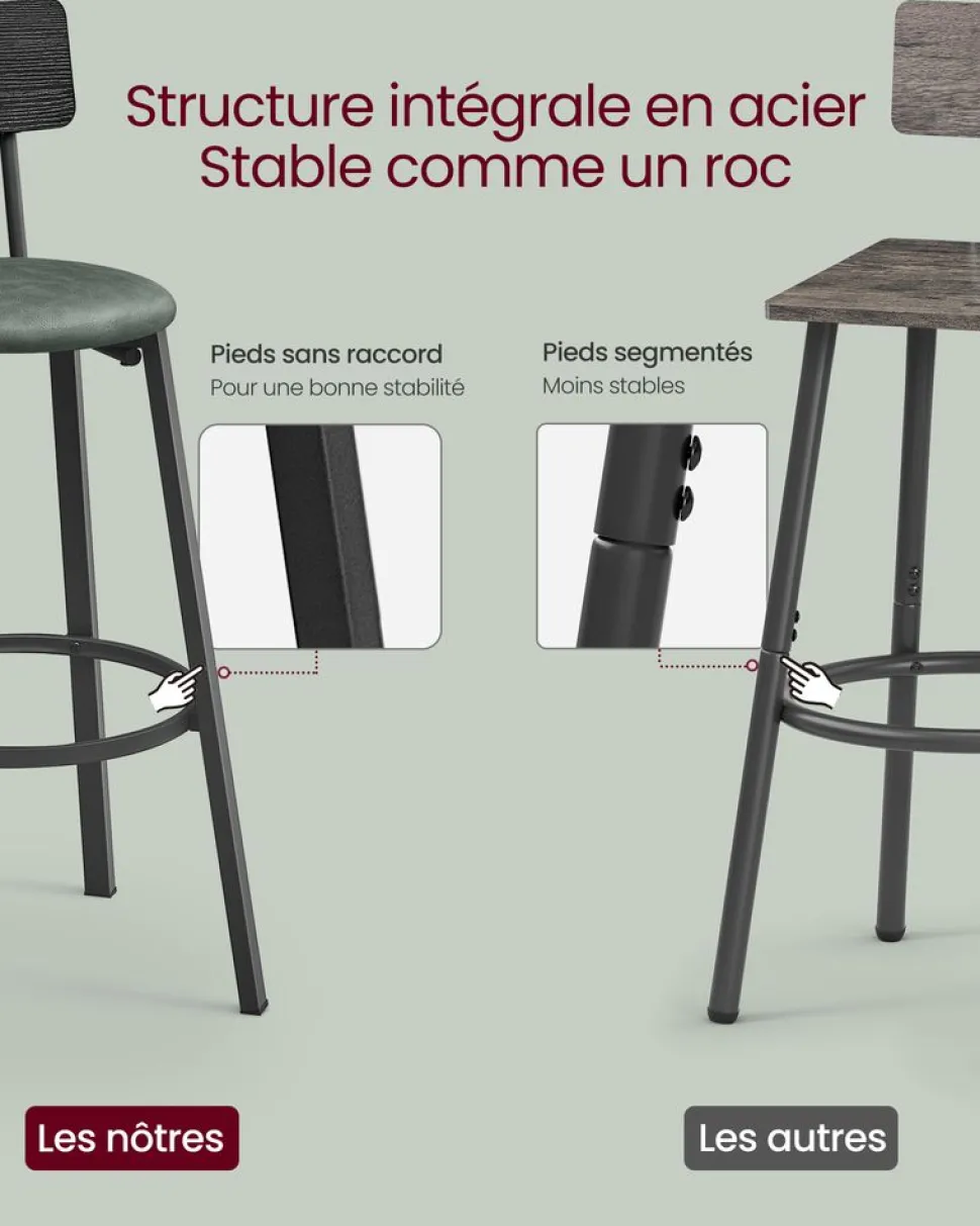Matériaux sélectionnés, siège sûr : Une chaise pas stable peut gâcher votre bonne humeur. Ce ne sera pas les cas avec celles-ci ! Faits en panneaux d’aggloméré de première qualité et en acier robuste, ces tabourets assurent une excellente stabilité