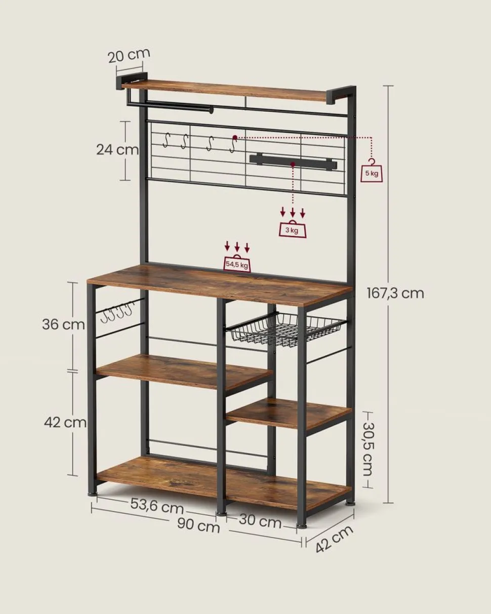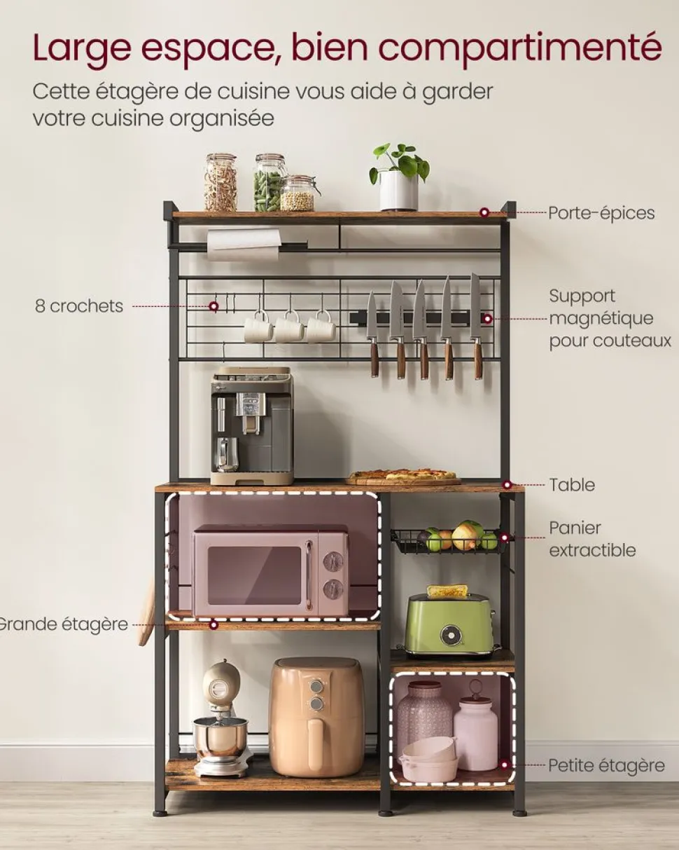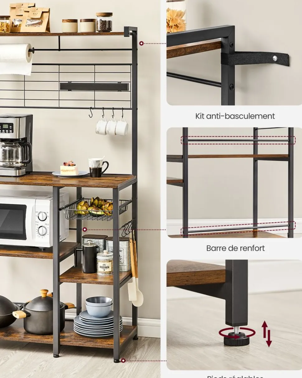 [Grand espace] Placez des épices sur l’étagère du haut. Suspendez des poêles et des spatules sur les 12 crochets. Posez la cafetière, le grille-pain et le micro-ondes sur la table. Organisez votre cuisine et préparez à manger en toute simplicité[Support aimanté pour couteaux et porte-rouleau] Grâce à sa force d’adhérence de 3 kg, gardez vos couteaux à portée de main en toute sécurité et au sec. Retirez et changez facilement les papiers absorbants avec le support pour essuie-tout[2 méthodes d’installation] Les pièces numérotées et les instructions illustrées vous aident à monter cette étagère sans effort. Vous pouvez changer les positons des étagères, du porte-rouleau ou du support magnétique, que ce soit à gauche ou à droite[Panier extractible pratique] Vous pouvez ranger vos ustensiles de cuisine dans le panier sous la table, le panier conçu comme un tiroir offre un accès facile et est équipé de butées pour éviter de tomber lors de son utilisation[Stable et sûr] Avec les panneaux d’aggloméré de qualité et la structure en acier, cette étagère est stable. Les pieds réglables améliorent la stabilité. Le dispositif anti-basculement rend cette