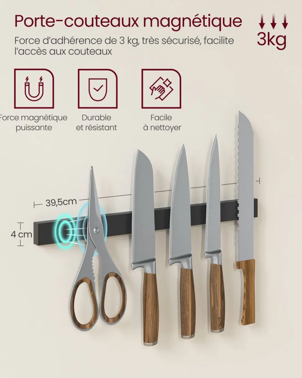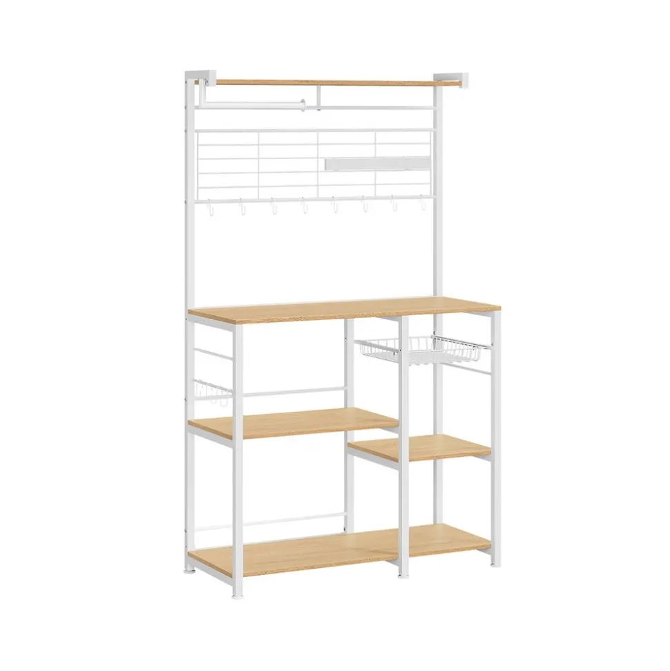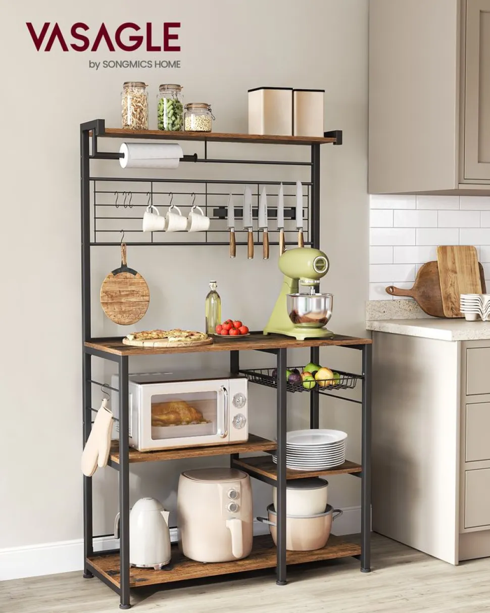 [Grand espace] Placez des épices sur l’étagère du haut. Suspendez des poêles et des spatules sur les 12 crochets. Posez la cafetière, le grille-pain et le micro-ondes sur la table. Organisez votre cuisine et préparez à manger en toute simplicité[Support aimanté pour couteaux et porte-rouleau] Grâce à sa force d’adhérence de 3 kg, gardez vos couteaux à portée de main en toute sécurité et au sec. Retirez et changez facilement les papiers absorbants avec le support pour essuie-tout[2 méthodes d’installation] Les pièces numérotées et les instructions illustrées vous aident à monter cette étagère sans effort. Vous pouvez changer les positons des étagères, du porte-rouleau ou du support magnétique, que ce soit à gauche ou à droite[Panier extractible pratique] Vous pouvez ranger vos ustensiles de cuisine dans le panier sous la table, le panier conçu comme un tiroir offre un accès facile et est équipé de butées pour éviter de tomber lors de son utilisation[Stable et sûr] Avec les panneaux d’aggloméré de qualité et la structure en acier, cette étagère est stable. Les pieds réglables améliorent la stabilité. Le dispositif anti-basculement rend cette