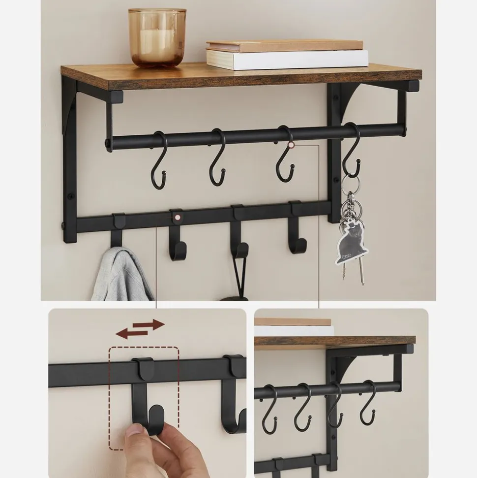 Habillé de 8 crochets : 4 crochets épais qui supportent jusqu’à 2,3 kg chacun pour des manteaux lourds et 4 crochets plus fins pour des trousseaux assistent ce meuble de rangement. Le plus ? Ils sont tous amovibles pour les placer où vous voulez