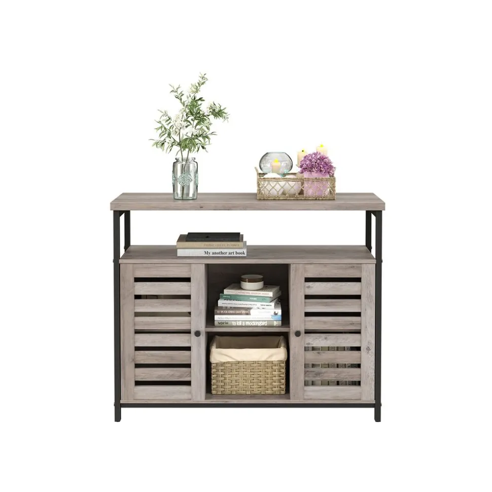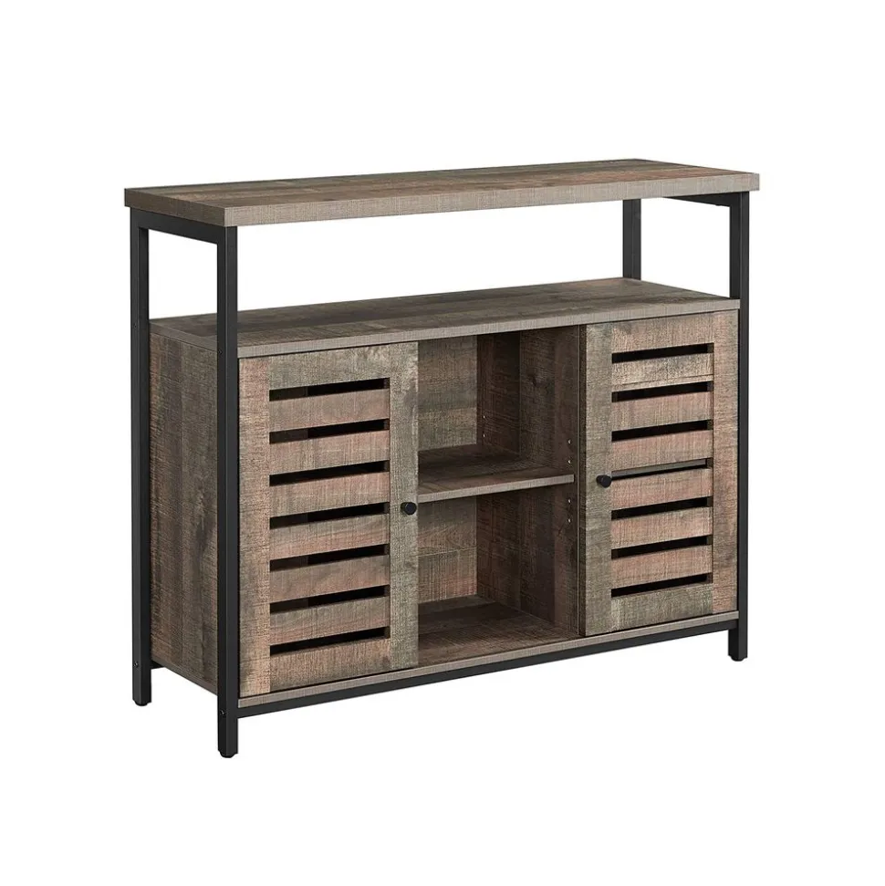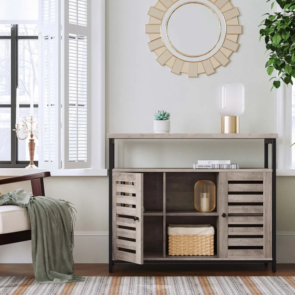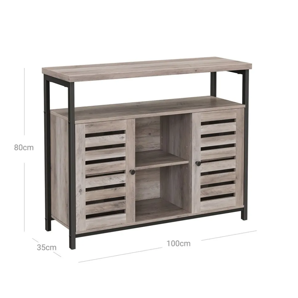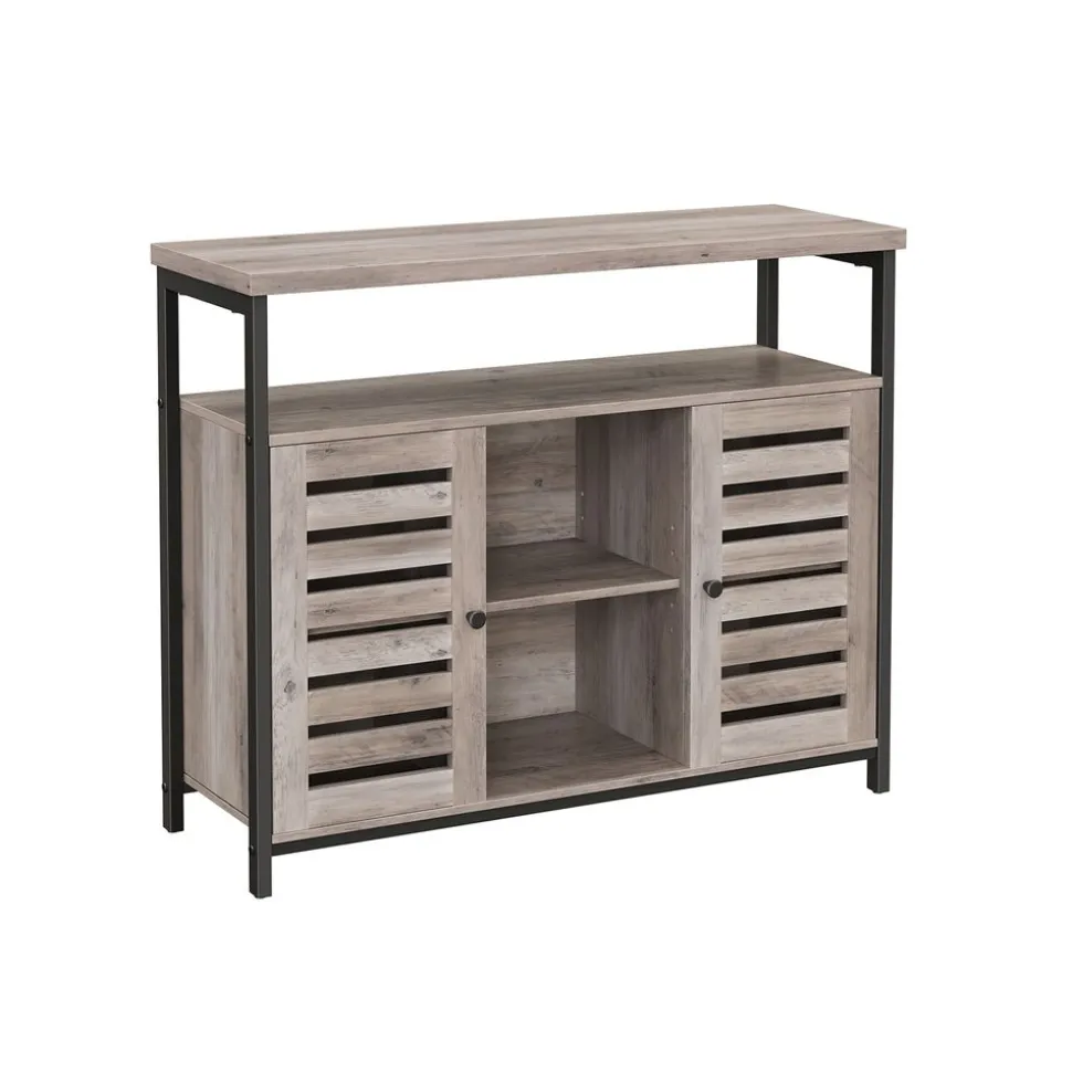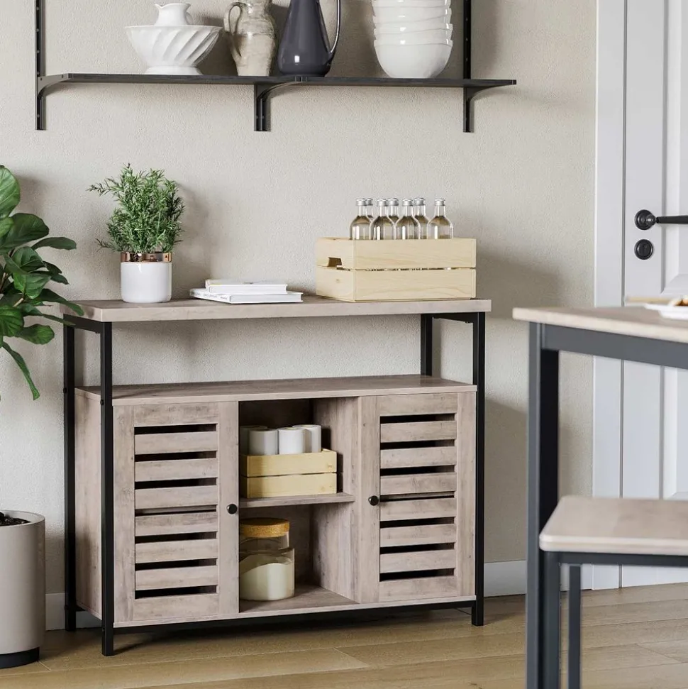 À CHACUN SA PLACE : Avec un dessus spacieux, 1 grand compartiment ouvert, 3 petits compartiments ouverts et 2 étagères réglables cachées derrière 2 portes persiennes, ce meuble offre beaucoup d’espace de rangement pour les décorations, les ustensiles de cuisine et plus encore