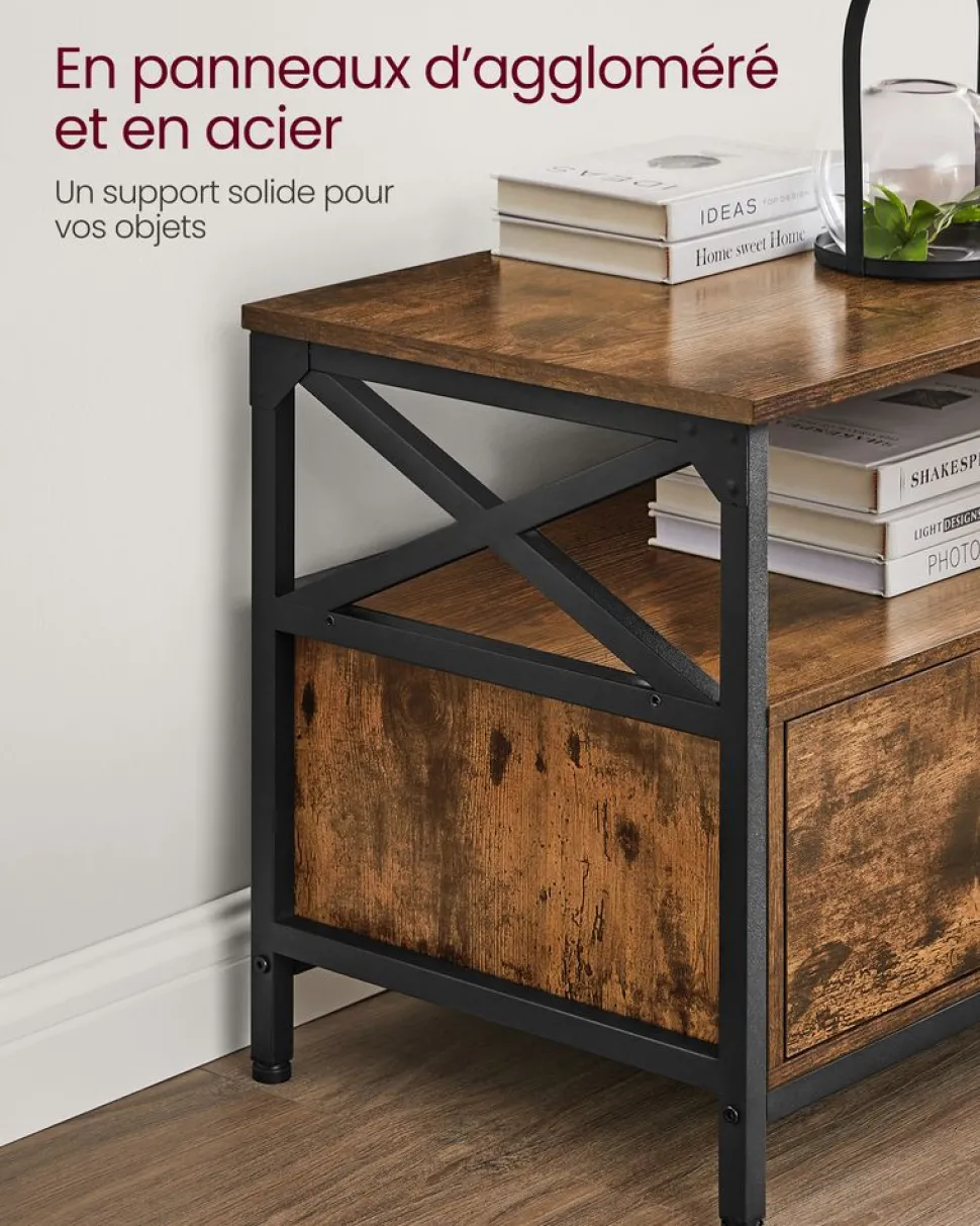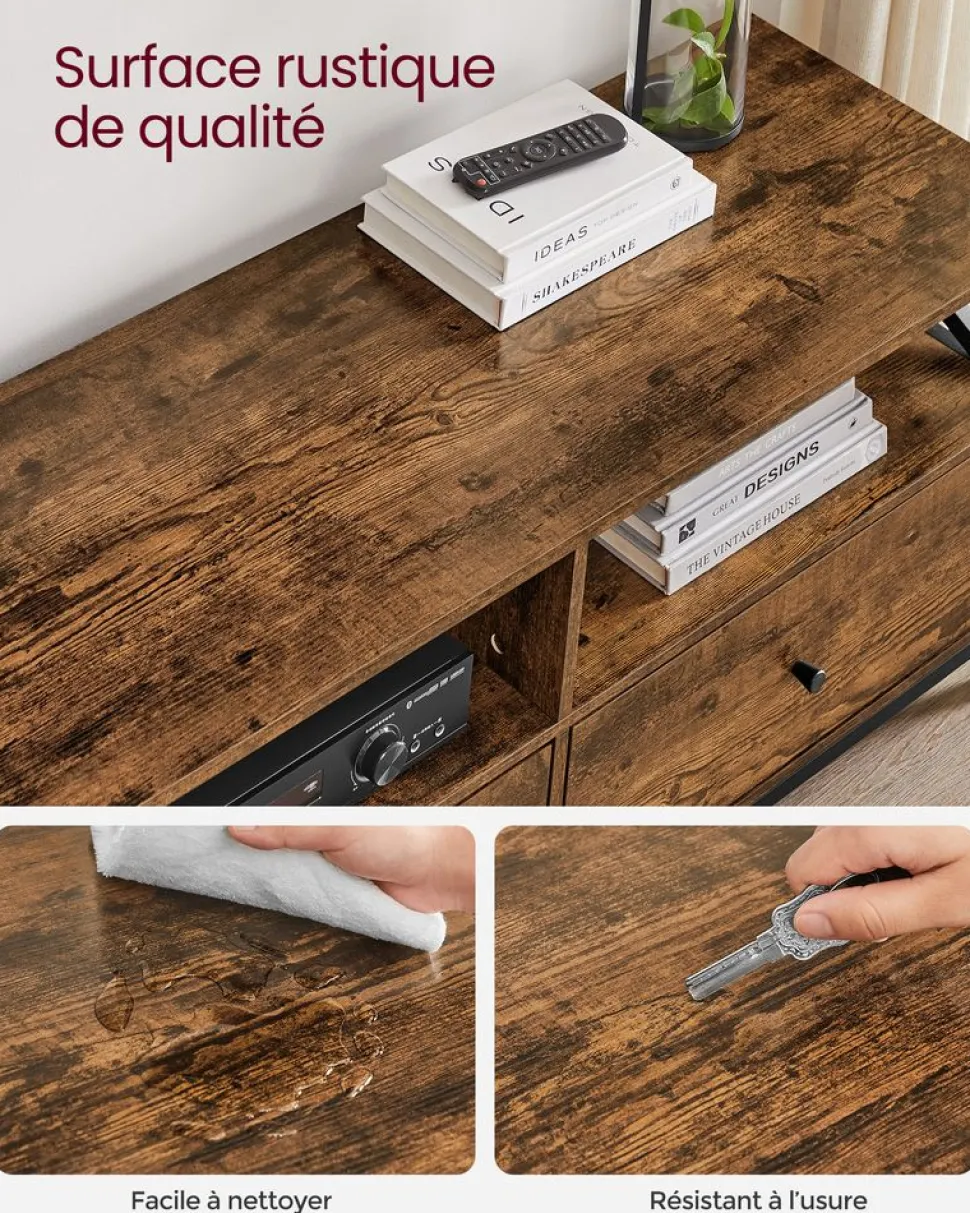 【UNE SOLIDITÉ À TOUTE ÉPREUVE】Conçu avec un système d’emboîtement, fabriqué en panneaux d’aggloméré doté de pieds en acier, ce meuble TV offre une structure de solidité et supporte jusqu’à 60 kg sur le plateau de la table et 113 kg au total