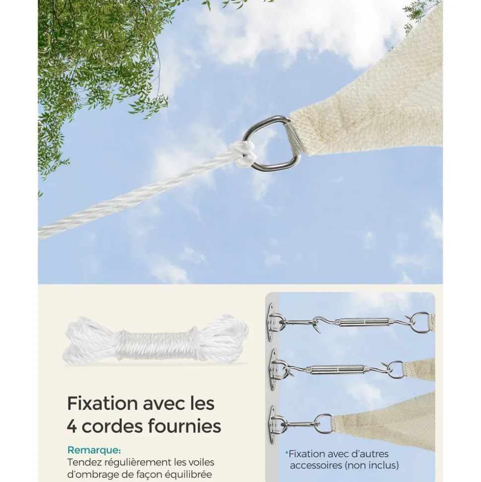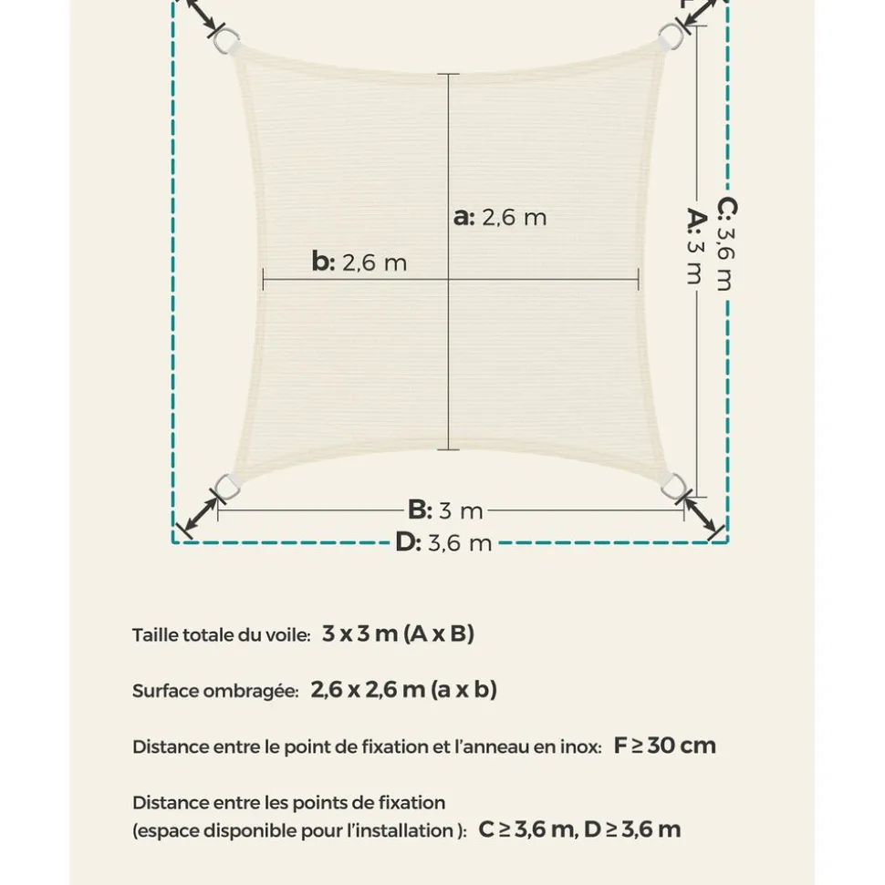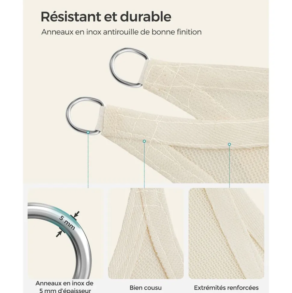 - Caractéristiques :Couleur : BeigeMatériaux : Mât en bois de hêtre, baleines en bois, tissu polyesterDiamètre de la toile : 2,7 mPoids : 8 kgLivraison :1 x Parasol1 x Mode d’emploi (FR, EN, DE, ES, IT)Précautions de SONGMICS :Le socle n’est pas inclus.Veuillez ne pas ouvrir le parasol avec trop de force. Veuillez ouvrir doucement et lentement.Veuillez fermer le parasol pendant les jours de vent pour éviter tout endommagement.Pour prolonger la durée de vie du produit, veuillez le protéger avec une housse (non incluse).Veuillez ne pas mettre les doigts directement dans le mécanisme d’inclinaison du parasol lors du réglage pour ne pas vous blesser.