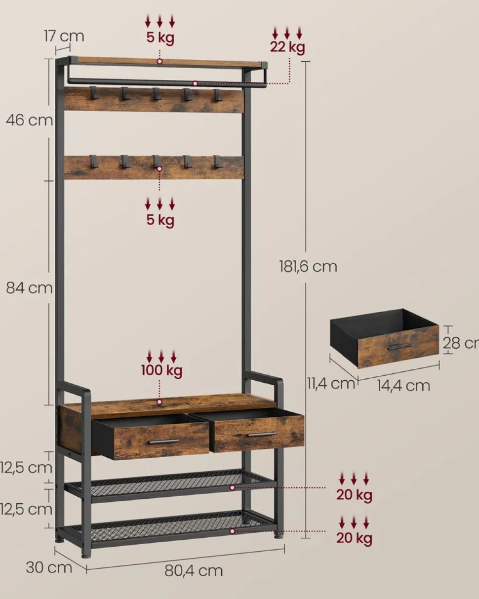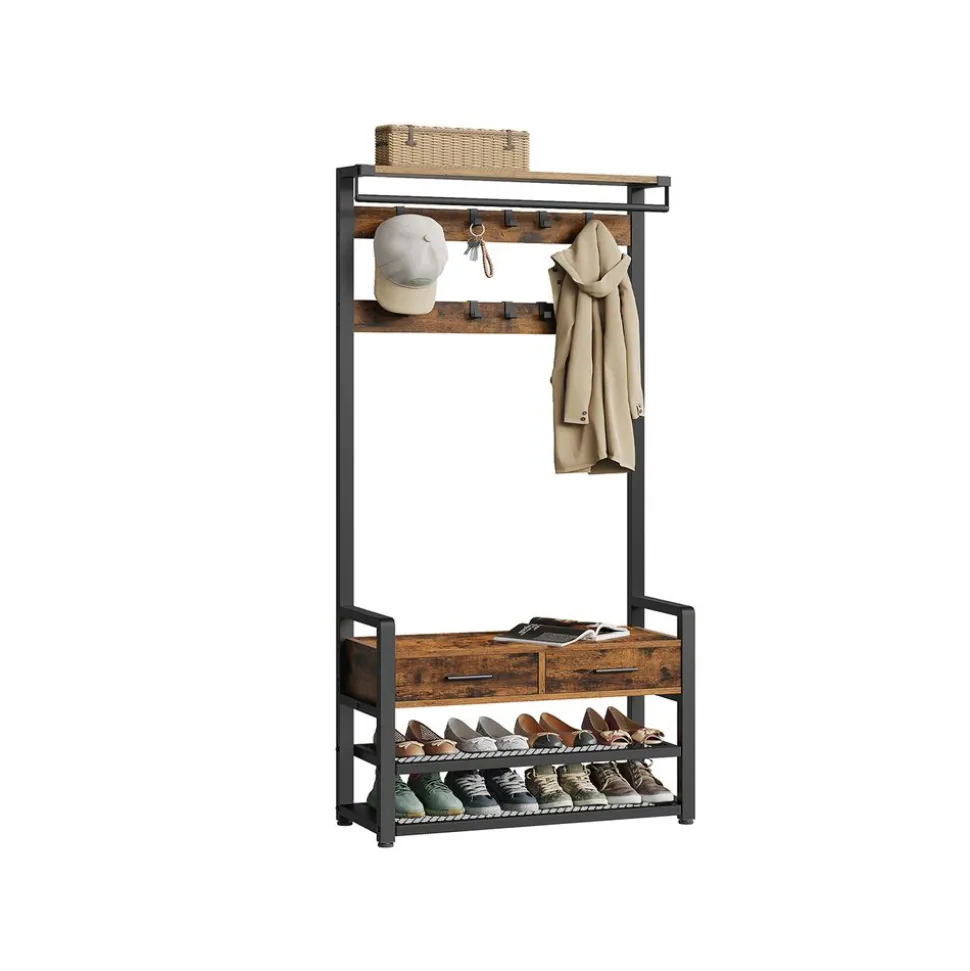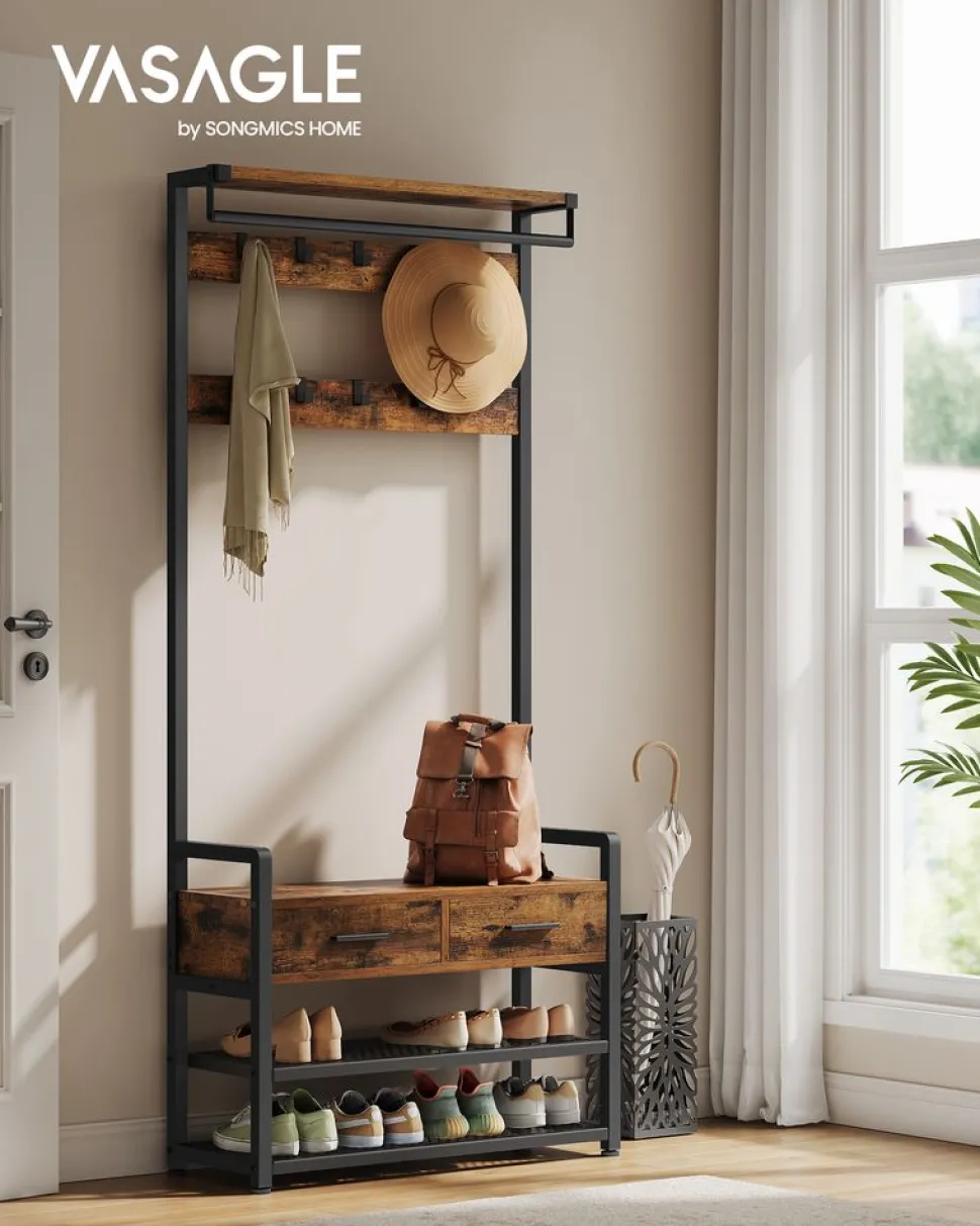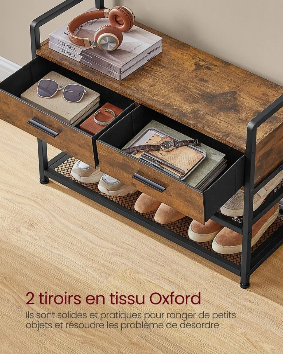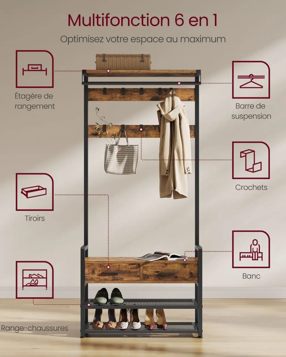 [Multi-fonction 6 en 1] Ce porte-manteau comprend des crochets, un banc, une range-chaussures, des tiroirs, une barre de suspension et une étagère de rangement pour optimiser l’espace et vous aider à créer une entrée organisée et fonctionnelle[Espace suffisant] Ce meuble d’entrée est équipé de 10 crochets amovibles pour suspendre vos manteaux, chapeaux, écharpes et sacs. Les 2 étagères inférieures peuvent accueillir 8 paires de chaussures[Tiroirs de qualité pratiques] Les 2 tiroirs sont fabriqués en tissu Oxford de qualité pour une grande solidité. Ils sont faciles à ouvrir et à fermer avec des poignées pour ranger des objets et les prendre quand vous en avez besoin[Conception séparable] Vous pouvez utiliser ce meuble d’entrée dans son ensemble pour tout ranger au même endroit, ou le séparer en une barre de suspension murale avec étagère et un banc range-chaussures pour une utilisation flexible[Robuste et stable] Le panneau d’aggloméré de qualité et l’acier solide sont à la base de ce porte-manteau résistant. Les pieds réglables et le kit anti-basculement offrent une stabilité et une sécurité accrues