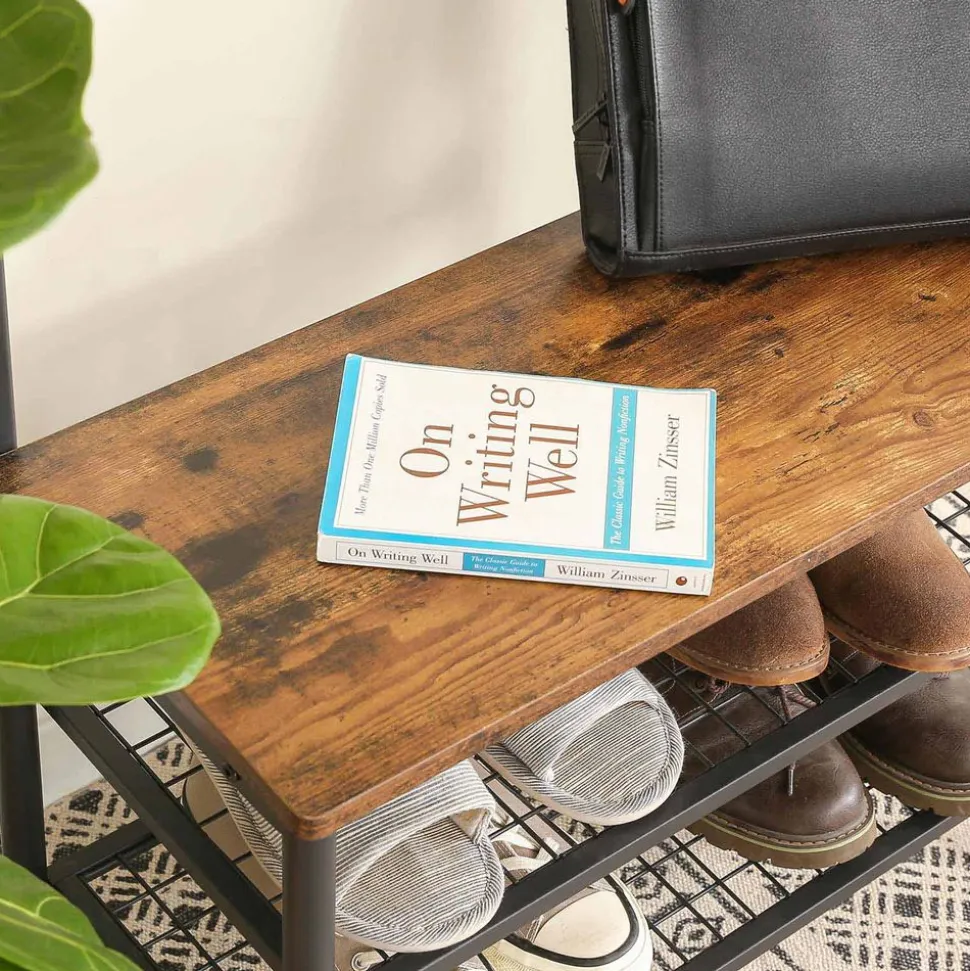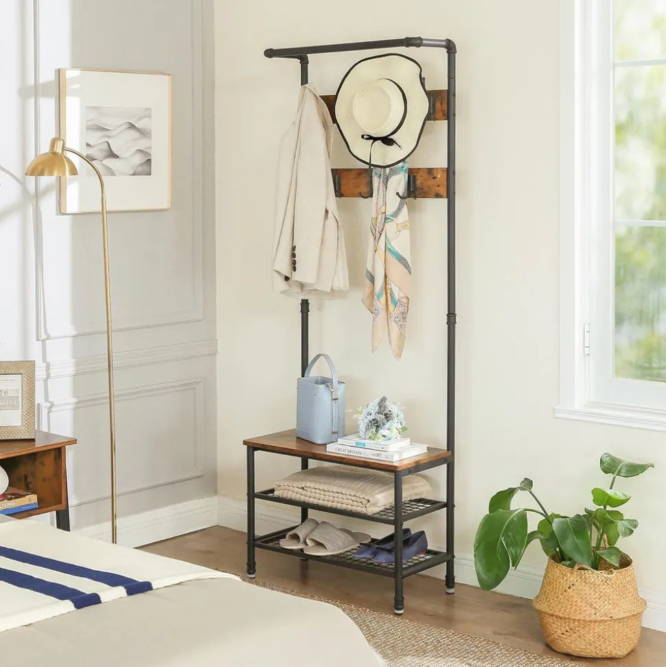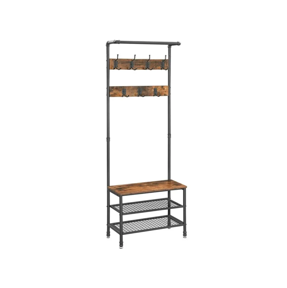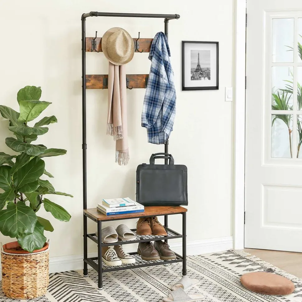 TOUT EST RÉUNI : Votre rendez-vous commence dans 20 minutes ! C’est une bonne chose que votre veste soit accrochée à l’un des 7 crochets de ce portemanteau et que vos chaussures soient sur l’une des deux étagères en maille. Asseyez-vous sur le banc et mettez rapidement vos chaussures !