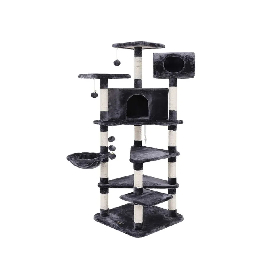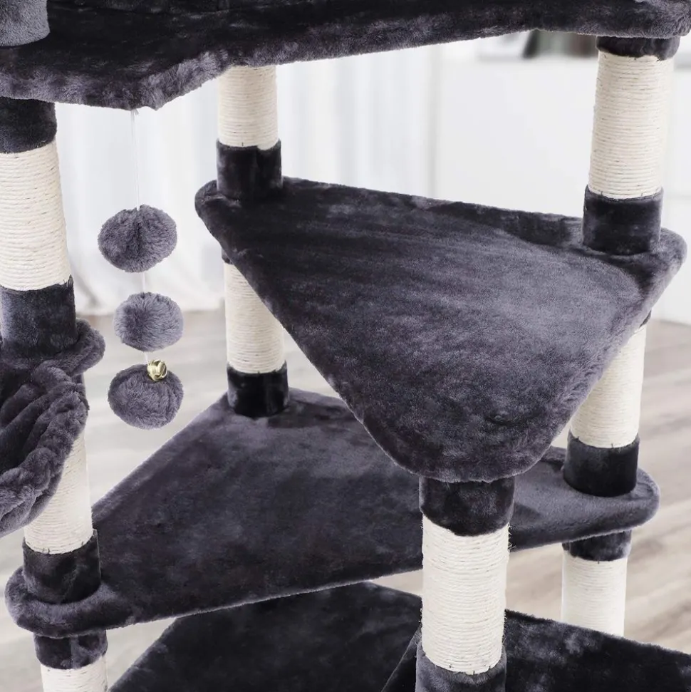 Cet arbre à chat offre une excellente combinaison de bonne qualité et de multi fonctionnalité grâce au matériau des panneaux d’aggloméré et à ses accessoires. Chaque tronc est recouvert de cordes en sisal, votre chat n’aiguisera plus ses griffes sur vos meubles. Par ailleurs, le jouet suspendu procurera beaucoup de plaisir au chat; la grande niche luxueuse et douillette offrent des endroits très agréables. Le socle solide et les rubans anti-renversement rendent ce produit plus solide et plus résistant. Votre compagnon pourra se divertir avec cet arbre à chat tout en ne sortant pas de la maison !