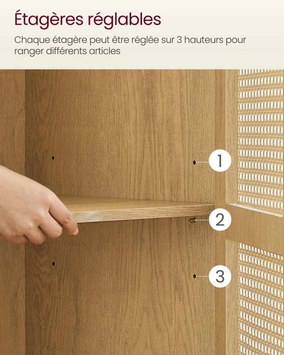 Construction robuste – Les panneaux en fibres de l’étagère de rangement sont assemblés par des chevilles à visser garantissant une grande stabilité. La surface est constituée d’un placage mélaminé anti-rayures et facile d’entretien