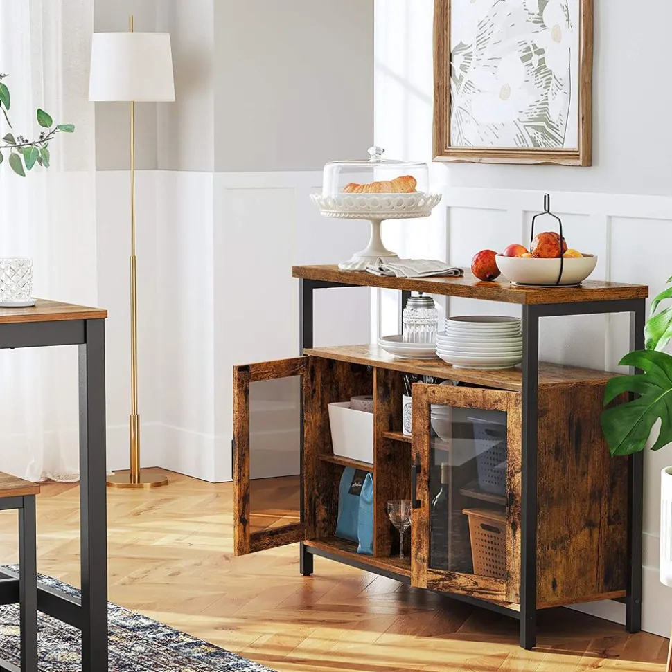 On vous sert quoi ? Je prendrais bien un organisateur à la surface boisée avec un marron rustique envoûtant et un cadre en métal noir industriel, le tout décoré de portes transparentes pour réveiller l’âme de mon salon