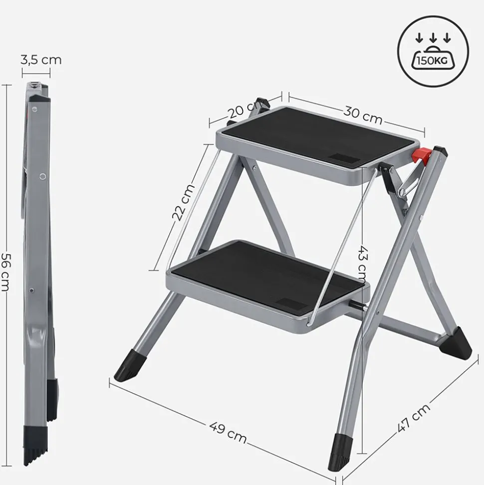 - Caractéristiques:Couleur: Gris métallisé, noir, orangeMatériaux: Aluminium, plastiqueDimensions pliées: 46 x 12 x 178 cm (L x l x H)Dimensions dépliées: 46 x 100 x 164 cm (L x l x H)Poids: 5,2 kgCapacité de charge: 150 kgLivraison:1 x Échelle1 x Notice de montage (FR, DE, EN, ES, IT)Précautions de SONGMICS:Vérifiez l’état de l’échelle avant l’utilisation. Le produit abîmé ne doit en aucun cas être utilisé.N’utilisez pas l’échelle s’il y a de l’huile, de l’eau ou toute autre substance mouillée ou glissante sur le sol.Il est interdit aux femmes enceintes et aux personnes à mobilité réduite d’utiliser ce produit.Il est interdit de se tenir debout sur la marche supérieur pour éviter de vous blesser en tombant.