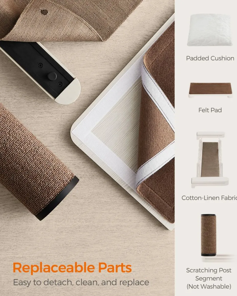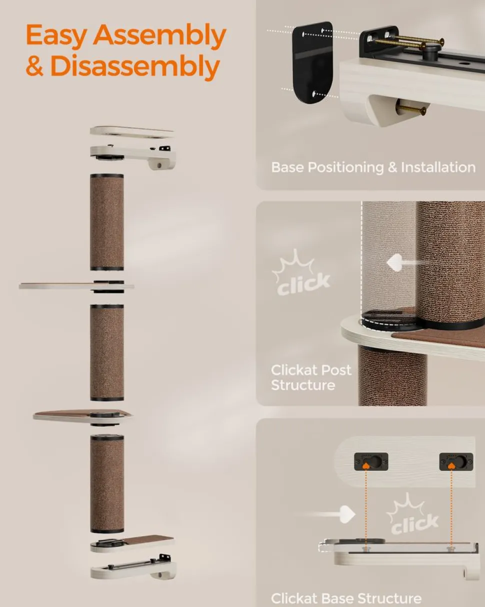 [Montage et démontage facile] Grâce à la structure Clickat unique, cet ensemble se monte et se démonte facilement, et vous gagnez 50 % sur votre temps. Il suffit de glisser et d’emboîter les différentes parties jusqu’à entendre un “clic” et c’est prêt ![Combinez, connectez, étendez. Possibilités infinies] Associez les modules selon les préférences de votre chat ou votre espace, raccordez-les pour un plaisir sans fin, ou agrandissez le terrain de jeu au fur et à mesure, créez une planète unique pour eux[Pièces remplaçables] Lorsque les patins en feutre, le tissu ou le coussin sont sales, ou que les parties du poteau à griffer sont abîmées, il est facile de les détacher pour les nettoyer ou les remplacer, afin de rénover le mur d’escalade de votre chat[Esthétique moderne] Inspiré des designs de meubles modernes, intégrant des éléments de conception cubiques et arrondis, cet ensemble de meubles pour chat moderne est à la fois simple et élégant et s’intègre facilement à votre maison[Robuste et fiable] Fabriqué avec des matériaux et des accessoires de qualité, cet ensemble de 10 pièces supporte jusqu’à 38,5 kg sur chaque module. Pas de problèmes pour les chats dodus, laissez-les grimper en toute liberté ![Contenu de l’ensemble Clickat Planet] 1 x arbre à chat, 1 x poteau à griffer, 1 x niche, 1 x étagère, 1 x large étagère, 1 x hamac, 1 x échelle avec hamac, 1 x meuble pour chat avec gamelle, 1 x pont, 1 x escalier