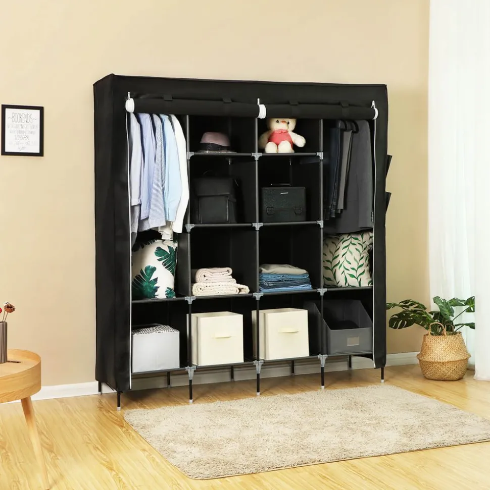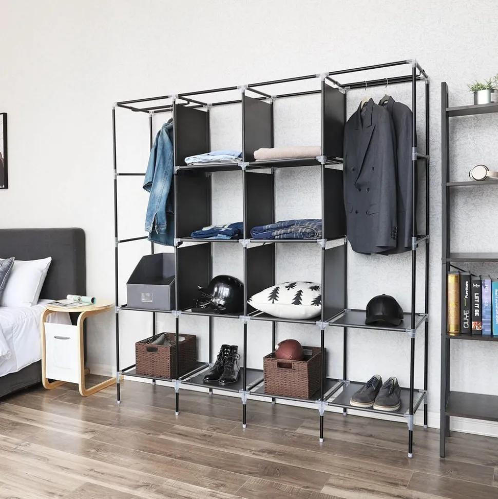 Fatigué d’entasser vos affaires n’importe où et de ne jamais trouver une placequi leur convient ? Cette jolie armoire en tissu non-tissé est peut-être la solution ! Avec sa finition parfaite, elle peut s’intégrer dans une petite chambre ou s’accorder parfaitement avec la décoration de votre bureau. Avec des barres à pendre et des étagères, vous pouvez ranger aisément tous vos vêtements et pendre vos chemises sans les froisser. Vous pouvez mettre le produit dans votre salon, chambre, salle de stockage ou garage pour ranger vestes, sacs, bonnets, écharpes, gants, casquettes, etc.Composé du tissu intissé et des tubes en métal, l’armoire assure une grande stabilité et pourra supporter une lourde charge. C’est absolument un bon choix pour le rangement.