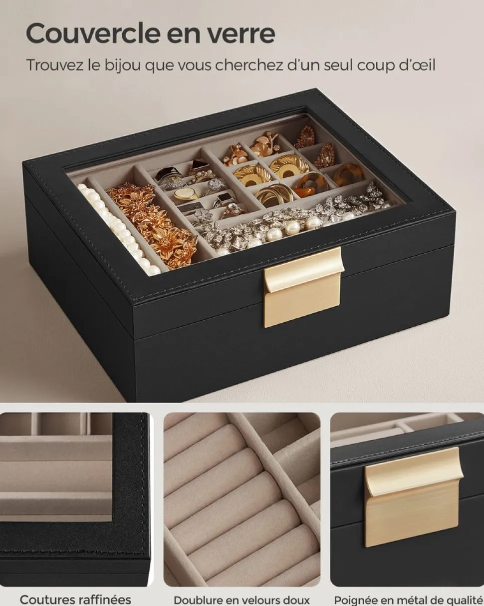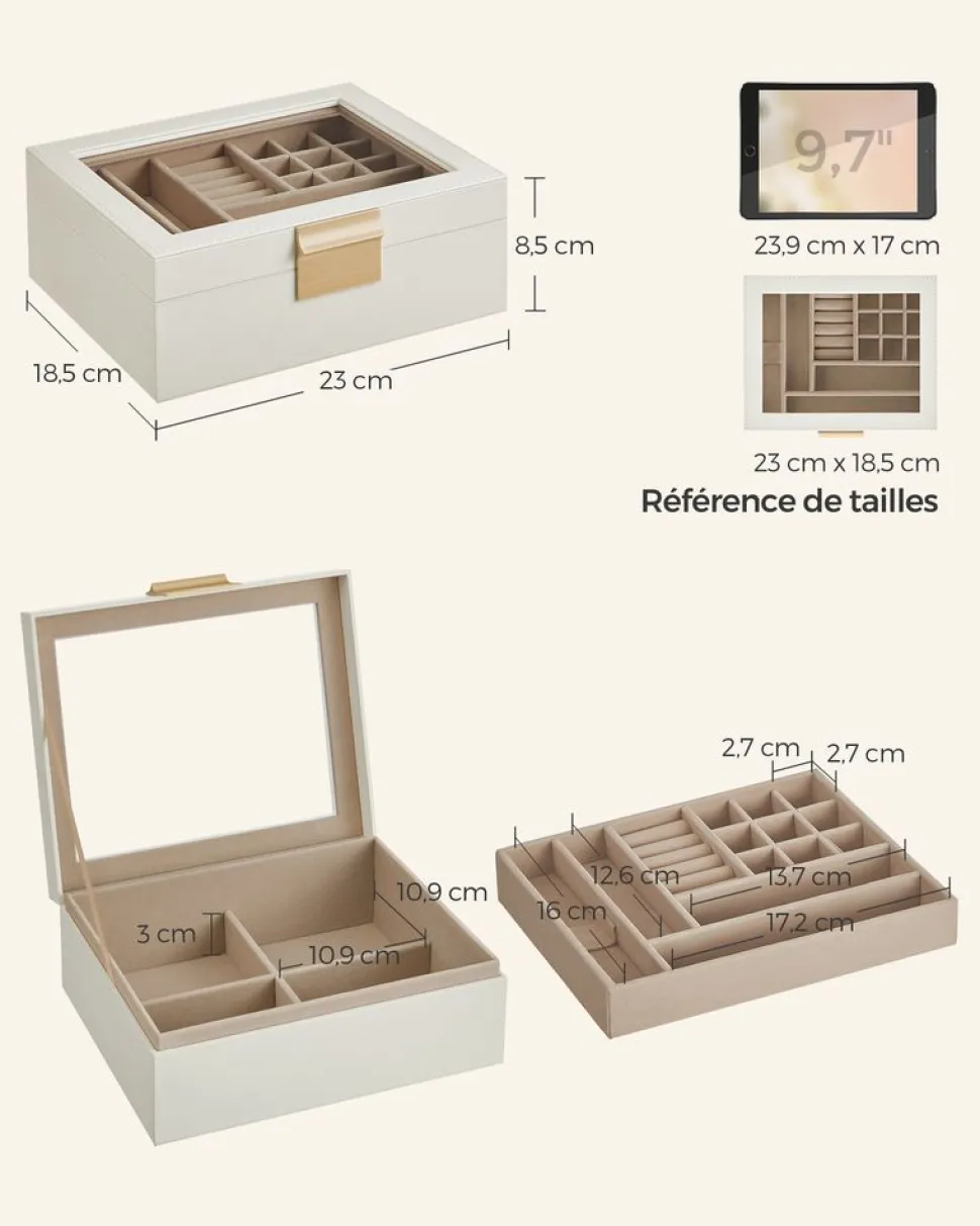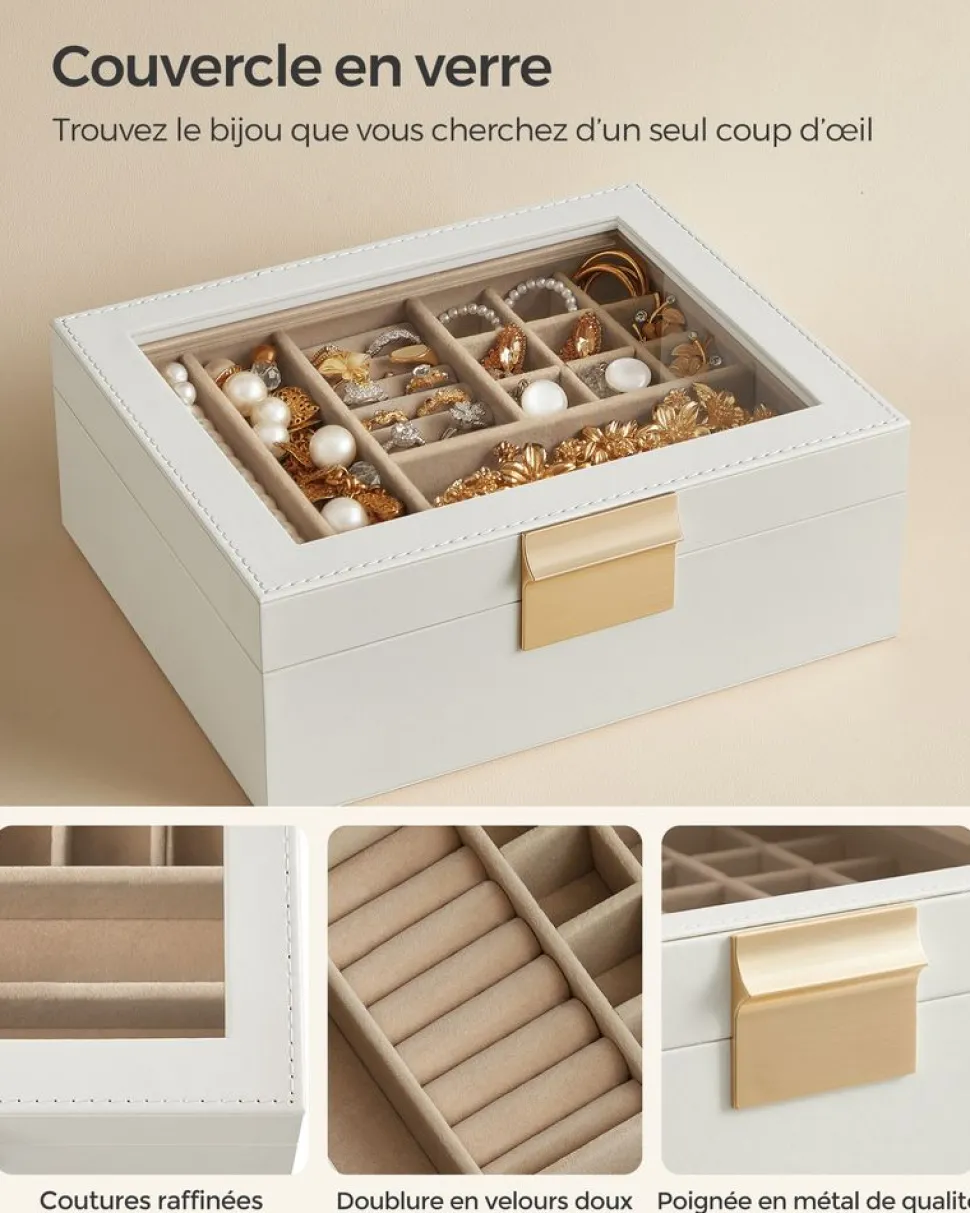 [Couvercle en verre transparent] Sous la surface en verre transparent, tous vos bijoux préférés sont visibles. Ils sont bien présentés et protégés de la poussière. C’est tellement plus simple de choisir vos accessoires préférés[Chic & durable] Avec une surface blanche, des poignées en métal doré, une doublure en velours doux, des coutures soignées et des panneaux MDF robustes, cette boîte à bijoux est chic et durable, idéale pour vos collections de bijoux[Beaucoup d’espace, pour beaucoup de bijoux] Avec 2 niveaux et 18 compartiments de tailles différentes, cet écrin à bijoux vous offre beaucoup d’espace de rangement pour trier vos accessoires tels que boucles d’oreilles, bagues et colliers[Polyvalent] Ce coffre à bijoux s’harmonise parfaitement avec la déco de votre chambre ou dans votre dressing. Il est pratique pour ranger vos broches, colliers, bagues et autres accessoires. Le plateau du haut, doté de poignées, est facile à enlever[Bonne idée de cadeau] Avec un design original et une finition raffinée, cette boîte à bijoux est parfaite comme cadeau pour vos proches. Ou faites-vous plaisir tout simplement !