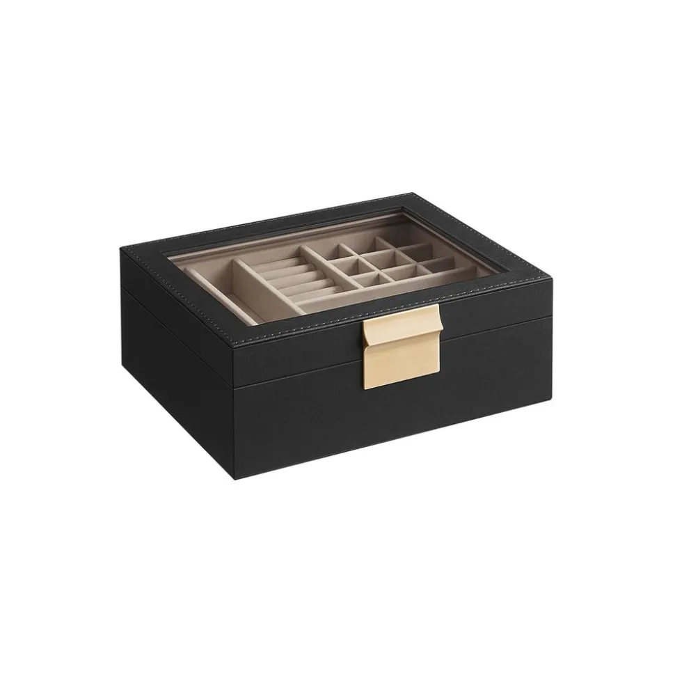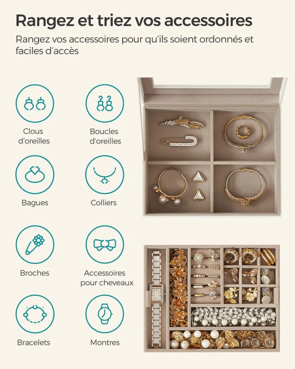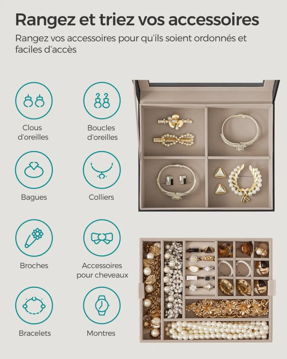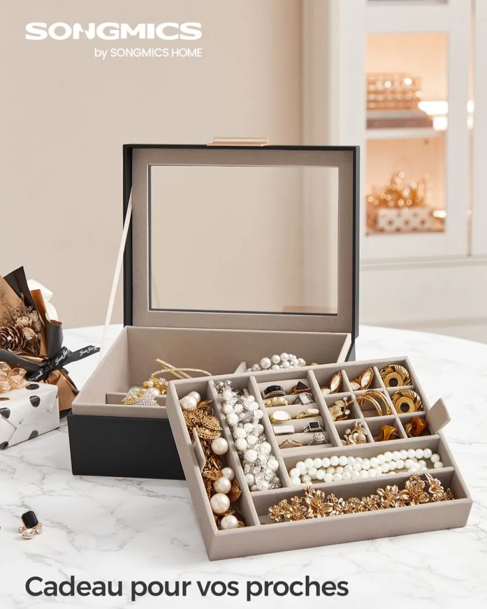 [Couvercle en verre transparent] Sous la surface en verre transparent, tous vos bijoux préférés sont visibles. Ils sont bien présentés et protégés de la poussière. C’est tellement plus simple de choisir vos accessoires préférés[Chic & durable] Avec une surface blanche, des poignées en métal doré, une doublure en velours doux, des coutures soignées et des panneaux MDF robustes, cette boîte à bijoux est chic et durable, idéale pour vos collections de bijoux[Beaucoup d’espace, pour beaucoup de bijoux] Avec 2 niveaux et 18 compartiments de tailles différentes, cet écrin à bijoux vous offre beaucoup d’espace de rangement pour trier vos accessoires tels que boucles d’oreilles, bagues et colliers[Polyvalent] Ce coffre à bijoux s’harmonise parfaitement avec la déco de votre chambre ou dans votre dressing. Il est pratique pour ranger vos broches, colliers, bagues et autres accessoires. Le plateau du haut, doté de poignées, est facile à enlever[Bonne idée de cadeau] Avec un design original et une finition raffinée, cette boîte à bijoux est parfaite comme cadeau pour vos proches. Ou faites-vous plaisir tout simplement !