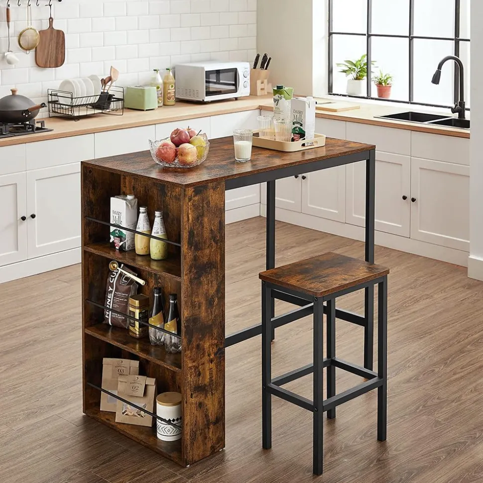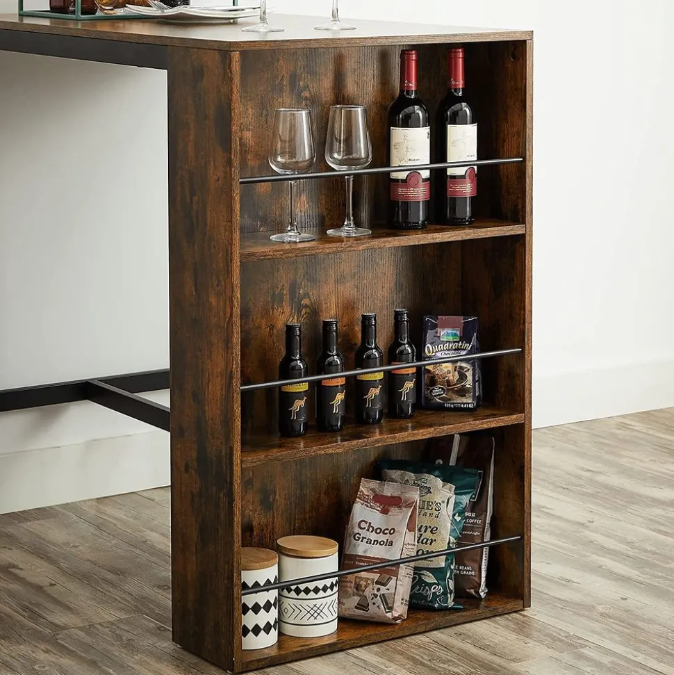 Avoir son bar à la maison ? Possible en optant pour cette table de bar ! Elle dispose d’étagères intégrées dans lesquels vous pouvez garder bouteilles de vin et verres à portée de main. En plus, des barres métalliques les protègent contre les chutes !