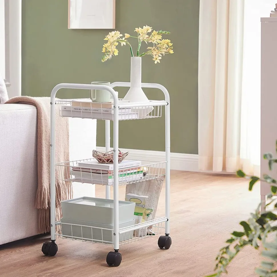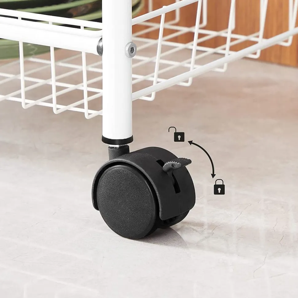 Livrée avec 3 paniers en fil métallique et 4 roulettes, cette étagère mobile SONGMICS multifonction vous offre de quoi ranger n’importe quelle pièce de la maison !
