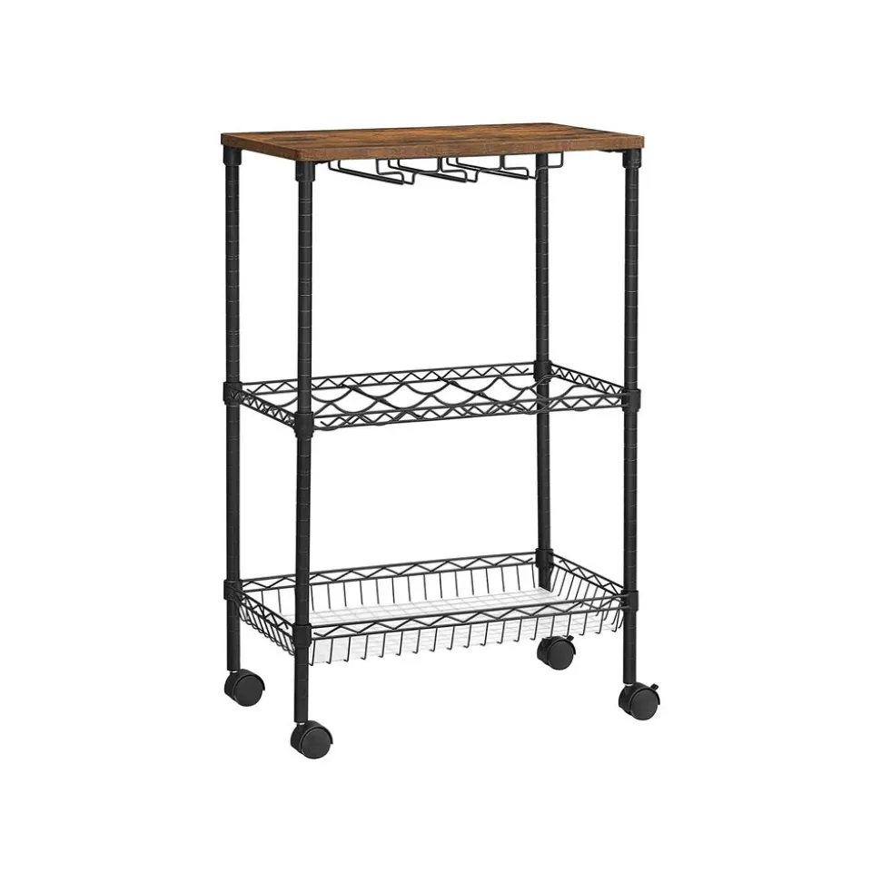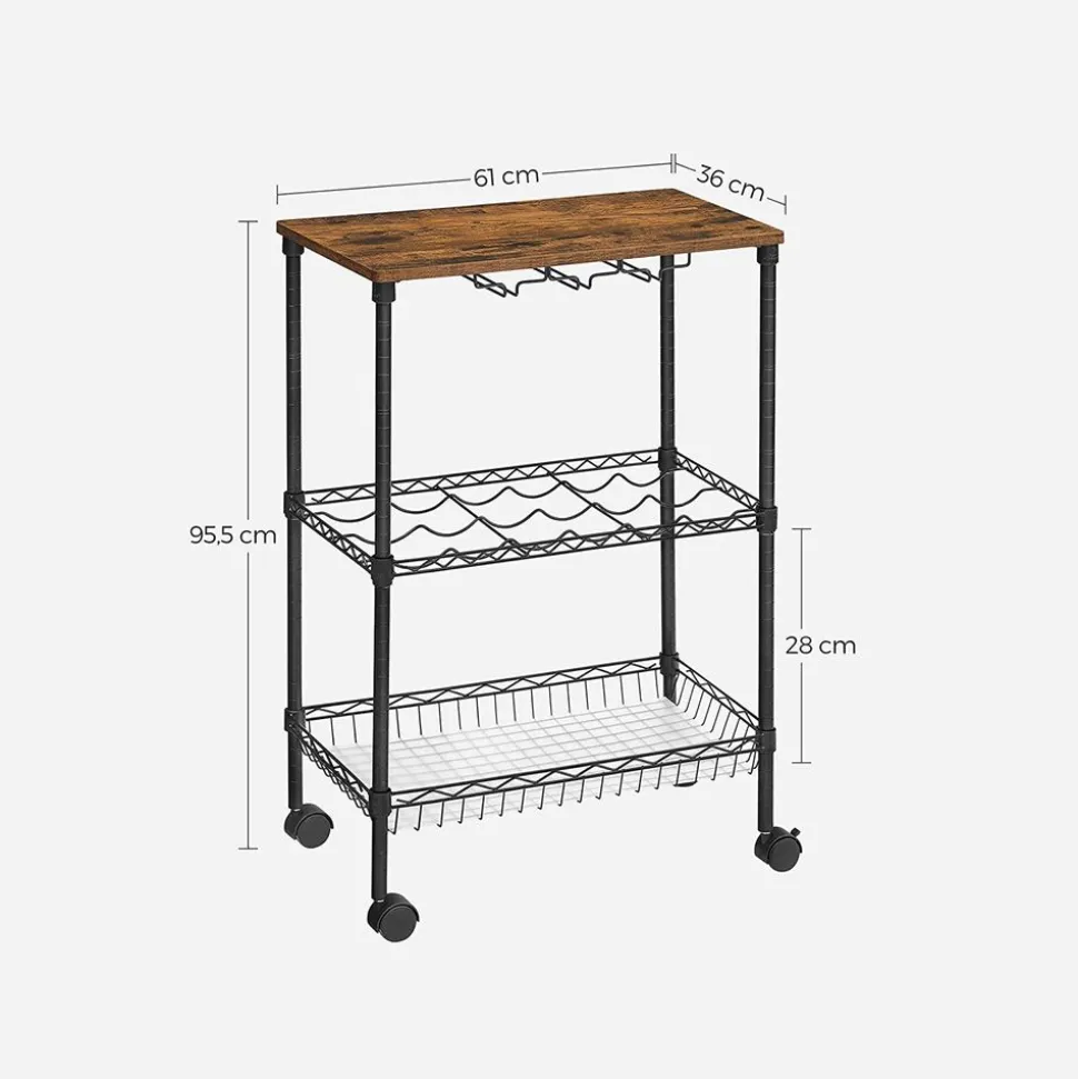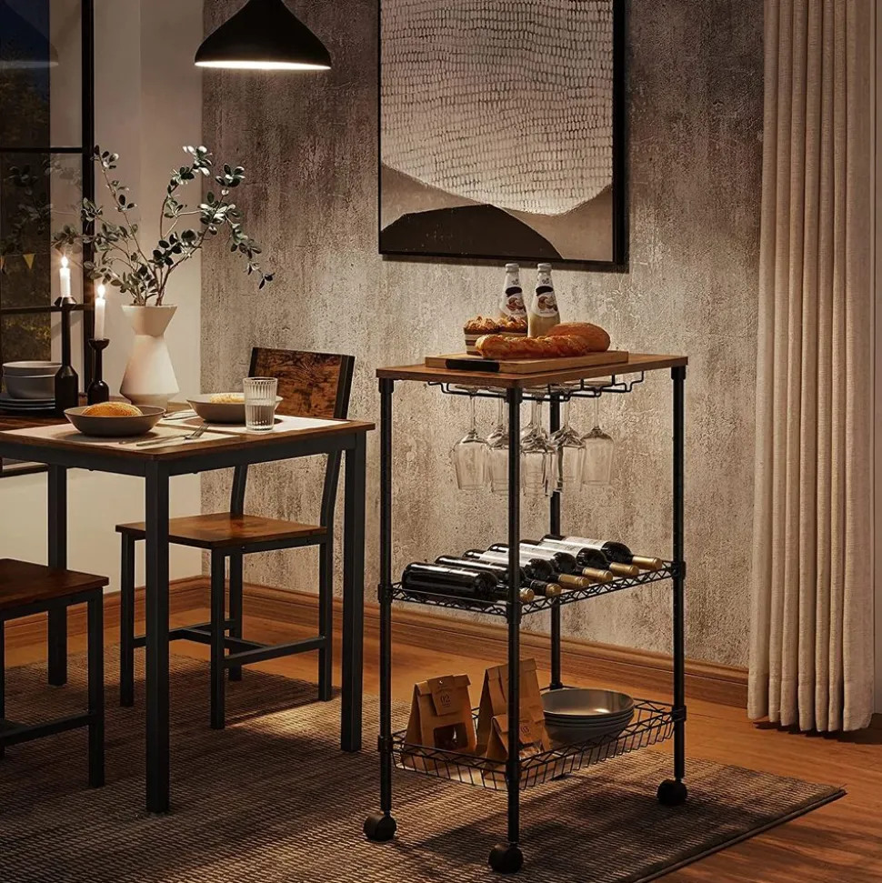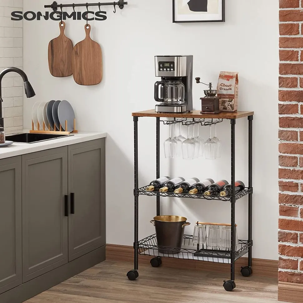Stylé et pratique : Le mélange du dessus marron rustique, des barres en métal noir et des fils métalliques confère une touche de charme industriel à votre cuisine, votre salle à manger ou votre salon. Qu’il soit utilisé pour servir des boissons, stocker des bouteilles de vins ou créer un coin bar, ce chariot de bar SONGMICS est très pratique.