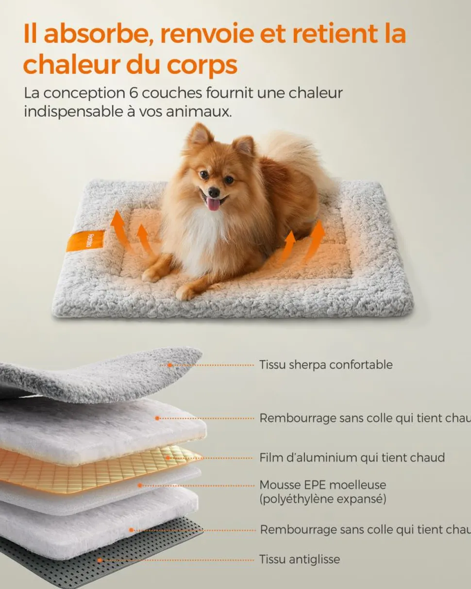 [Tout chaud] Ce coussin pour animaux à 6 couches absorbe, renvoie et retient la chaleur du corps de votre animal de compagnie. Ce n’est pas simplement un matelas pour animaux, c’est une source de chaleur naturelle qui garde votre animal bien au chaud[Confort moelleux, doux sommeil] Cette couverture pour animaux, fabriquée à partir d’un tissu sherpa super doux de 240 g/㎡, offre un grand confort. Elle convient aux bébés animaux, aux animaux en phase de guérison après une chirurgie ou aux animaux âgés[Nettoyage facile] Ce tapis pour chien est facile à nettoyer. Il suffit de le mettre dans la machine à laver (pas besoin d’enlever la housse), puis de le sécher en machine à basse température. Débarrassez-vous des galères de nettoyage[Solide, sécurisé, rassurant] Ce lit pour chien est doté d’une base antiglisse avec des picots en caoutchouc pour éviter les glissements. C’est une couche sûre pour vos animaux âgés ou turbulents, assurant leur tranquillité pendant le repos[Polyvalent] De dimensions 60 x 45 cm, ce tapis est idéal pour les chatons, les chiots et les lapins. Il s’intègre partout : par terre, sur le canapé, dans les cages ou les chenils et crée un espace confortable, que ce soit à la maison ou en voyage