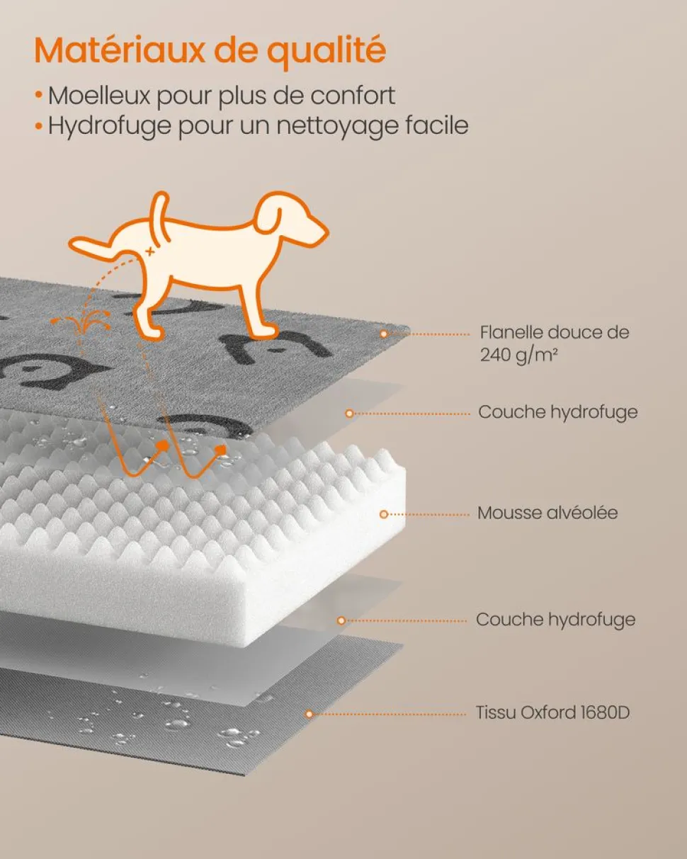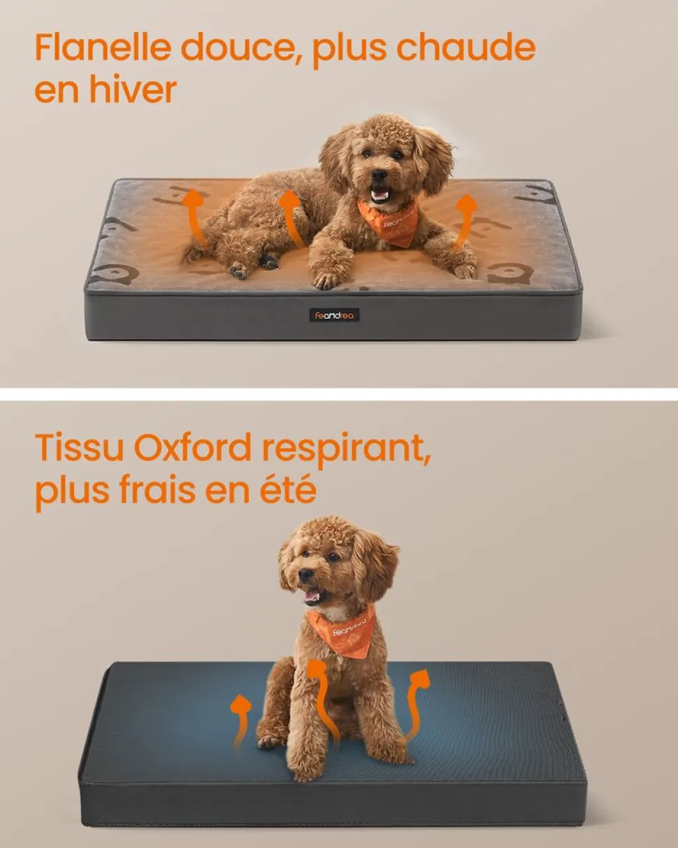 【MATIÈRES DE QUALITÉ】La surface en flanelle de 240 g/m² est douce et confortable, les côtés et le fond en tissu Oxford 1680D sont épais et rendent ce coussin pour animaux résistant. De plus, elle ne retient pas les poils et ne laisse pas les liquides s’imprégner