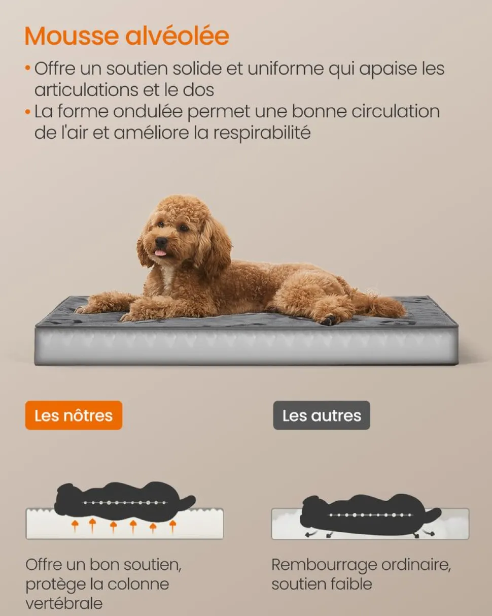 【CONFORT ORTHOPÉDIQUE】Ce panier offre un confort orthopédique grâce à sa mousse alvéolée qui répartit uniformément le poids du chien, réduisant la pression sur ses articulations et améliorant la circulation de l’air, parfait pour les chiens âgés
