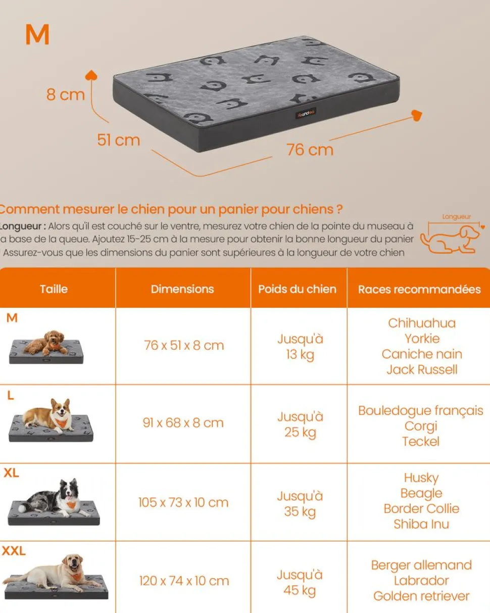 【DIMENSIONS ET CONSEILS】Ce panier de dimensions 76 x 51 x 8 cm est idéal pour les chiens miniatures et de petite taille jusqu’à 13 kg. Il est livré dans un emballage sous vide. Secouez-le et laissez-le prendre l’air pour qu’il reprenne sa forme