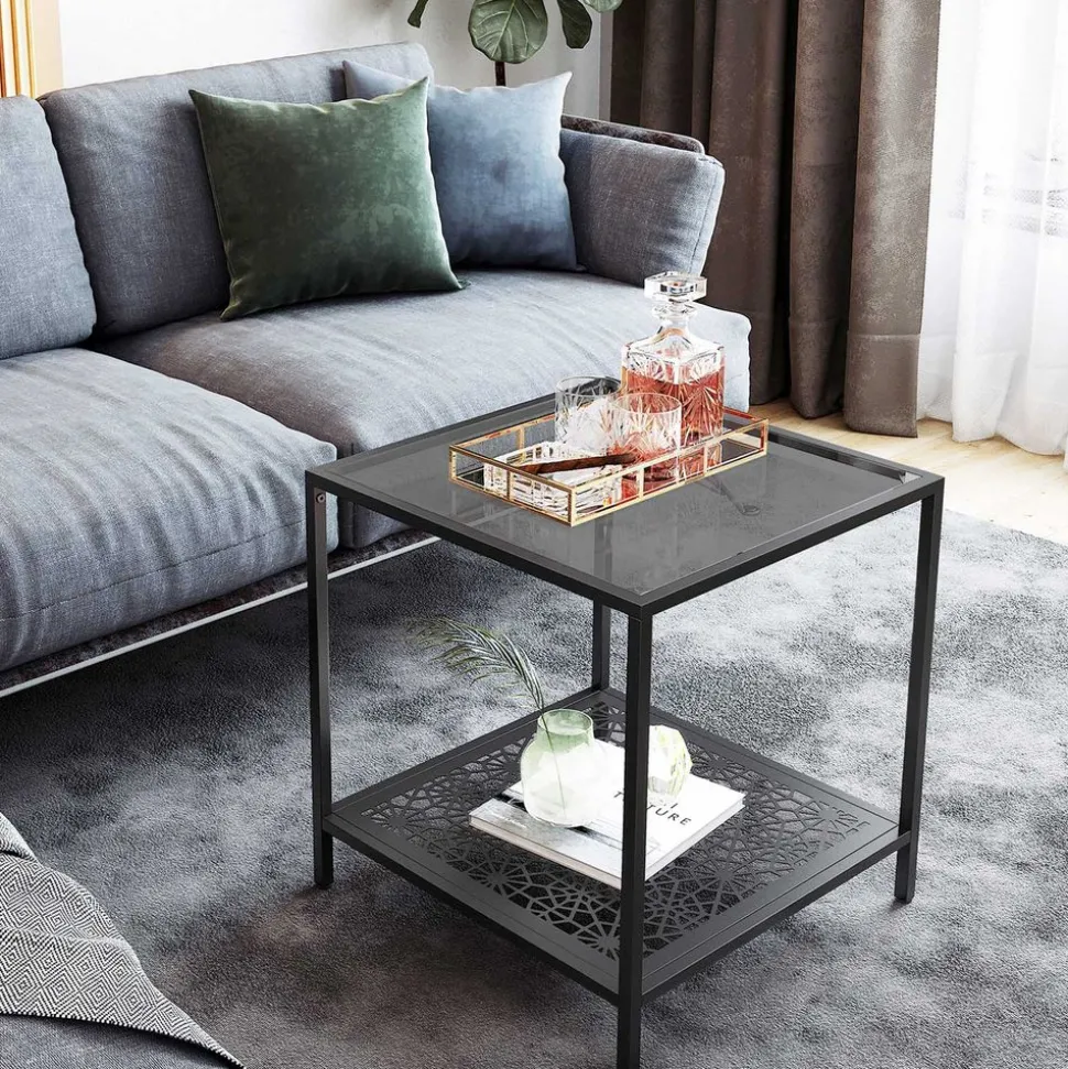 JOLIE ET RIGIDE: Malgré les jolies découpes sur l’étagère de cette table basse, sa capacité de charge est de 20 kg. Le plateau en verre peut également supporter jusqu’à 40 kg