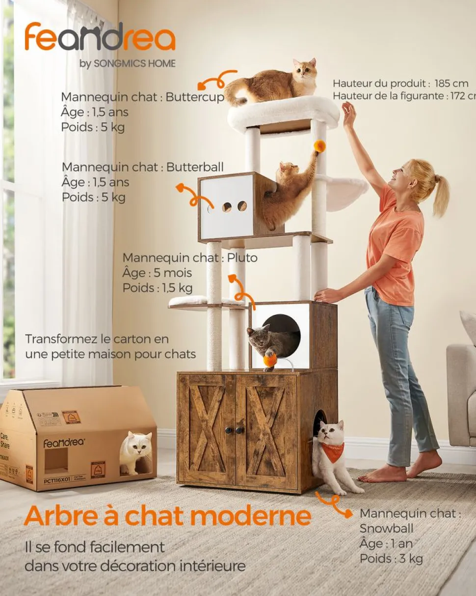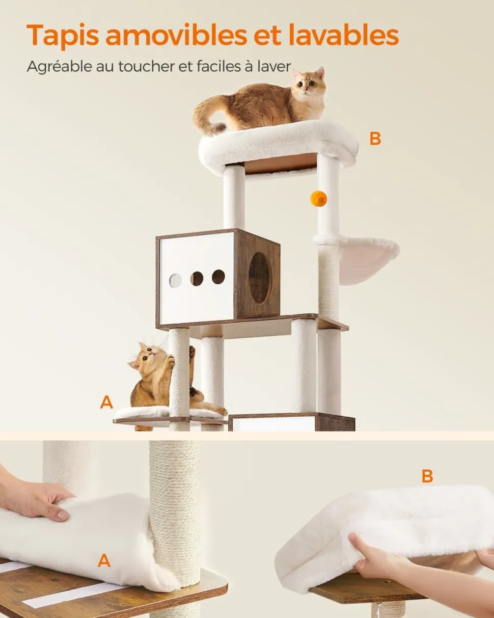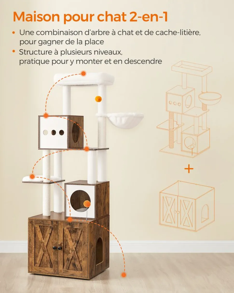 [S’intègre facilement dans la maison] En marron rustique et en blanc, cet arbre à chat moderne s’intègre facilement à la plupart des styles de maison et ajoute une touche charmante à n’importe quel environnement[Arbre à chat 2-en-1] Ce meuble est une combinaison d’arbre à chat et de cache-litière, il offre à vos chats un espace qui leur est propre et s’adapte facilement dans un coin de 104 x 61 cm, une véritable solution gain de place[Sauter, observer, faire les griffes] Ce griffoir à plusieurs niveaux facilite l’escalade, avec une plateforme pour observer leur territoire, des griffoirs pour satisfaire leur instinct naturel d’aiguiser leurs griffes[Douillet et confortable] Les plateformes sont recouvertes de tissu peluche de 500 g/m², plus dense, doux et moelleux que le tissu peluche ordinaire. Votre ami félin adorera faire la sieste et se blottir sur ces tapis tout doux[Facile à nettoyer] Le compartiment fermé évite que de la litière traîne partout. Les panneaux peuvent être nettoyés avec un chiffon humide, tandis que les tapis peuvent être brossés ou passés au rouleau anti-poils. Les tapis sont lavables en machine[Stable et sûr] Doté de pieds réglables et d’un kit anti-basculement, ce griffoir est stable même sur un sol légèrement irrégulier. Fixé au mur, il offre un niveau élevé de sécurité pour vous et vos chats[2 pompons de rechange] En plus des 2 pompons oranges qui divertissent les chats, cette tour de jeu pour chats est également livrée avec 2 pompons blancs de rechange