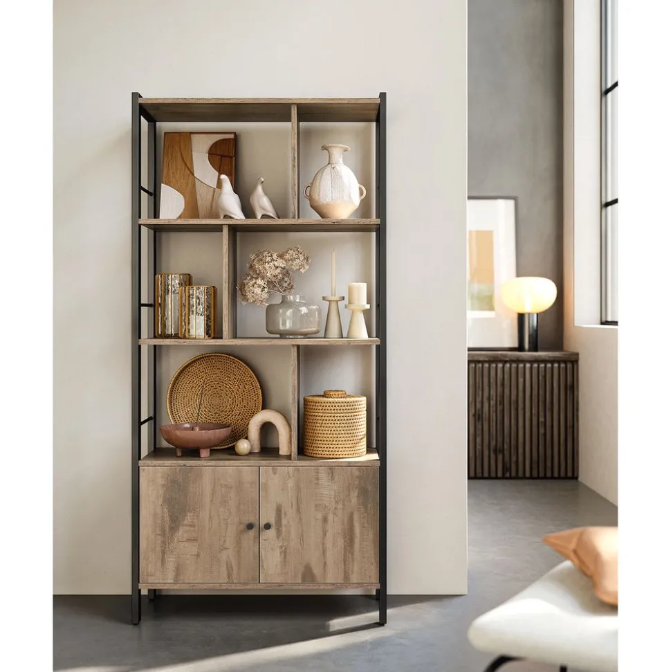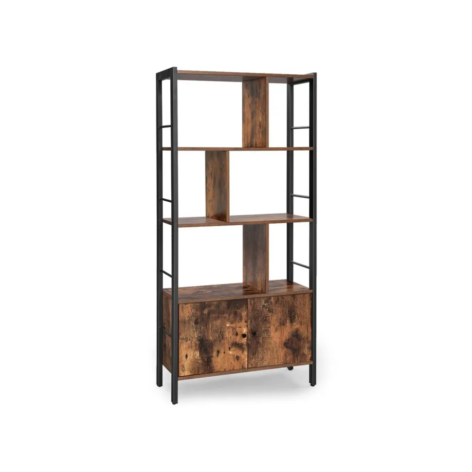 [Un moyen en plus de ranger] Cette étagère de rangement à 4 niveaux est munie d’un compartiment fermé en bas avec des portes doubles. Des barres latérales empêchent vos objets de tomber, pourquoi pas accrocher des objets sur les côtés ?[Cloisons en zigzag] Ni tous à droite, ni tous à gauche ! Les 3 compartiments ouverts de la bibliothèque sont équipés de séparateurs qui permettent un rangement créatif[Au même niveau] Des planches qui penchent, ça fait mal aux yeux ? Ça n’arrivera pas avec ce meuble ! Grâce à des pieds réglables, cette étagère se tiendra bien droite[Agrandissez vos collections !] Avec un cadre en acier durable et des étagères en panneau d’aggloméré de qualités, n’arrêtez pas votre envie de collectionner ! Livres et bibelots, chaque niveau supporte jusqu’à 20 kg[Idée déco] Donnez vie à vos idées déco avec cette table et transformez votre chez-vous en une maison de rêve dès maintenant. Cette étagère fait partie de la Collection ALINRU