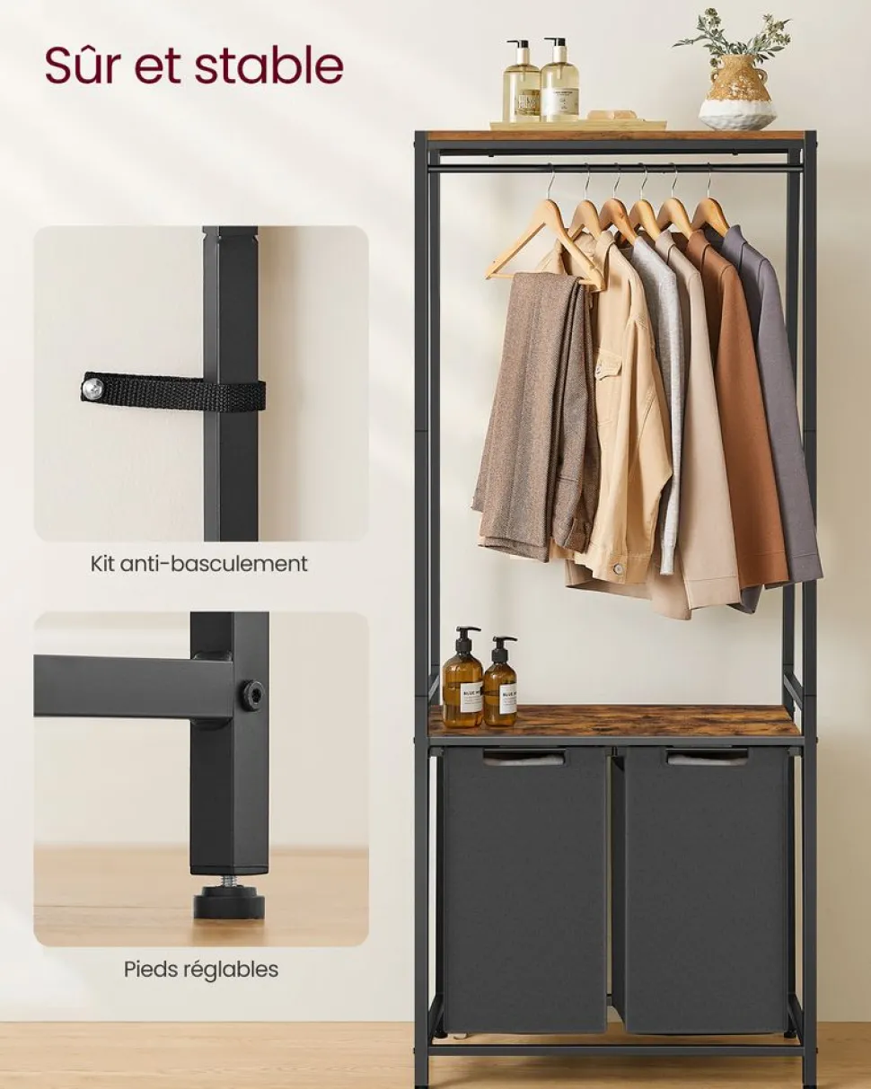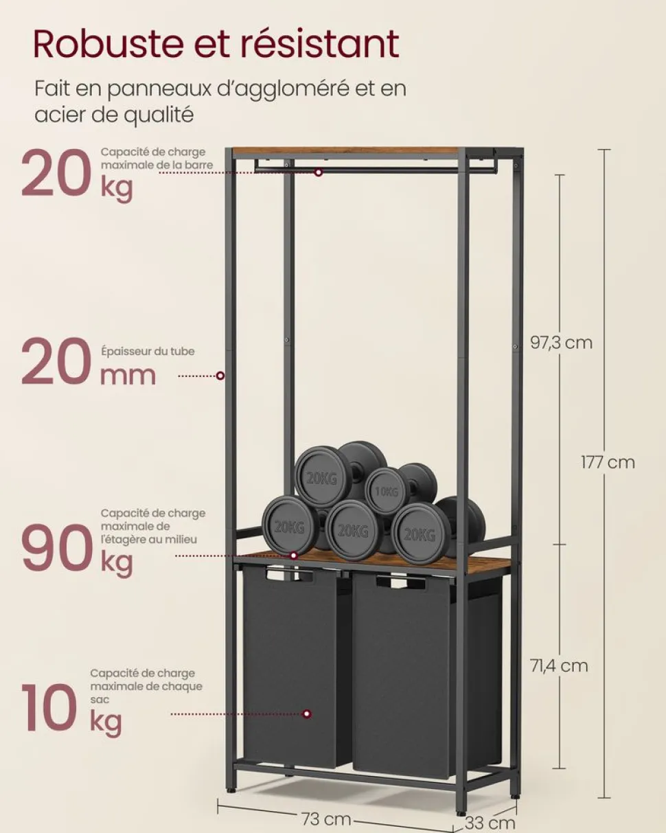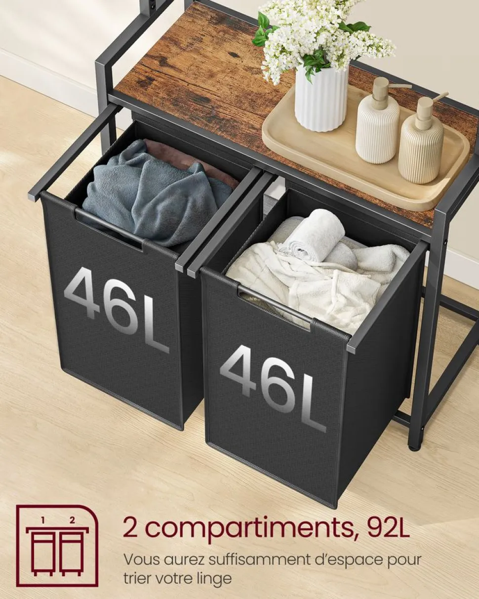 [Double panier à linge, tri par type] Ce panier à linge a un volume total de 92L (46L par sac), vous avez suffisamment d’espace pour le linge sale d’une semaine de toute la famille. Avec 2 compartiments, pratique pour trier le linge[Plateau pratique] Le plateau au-dessus des sacs vous offre un espace supplémentaire pour les détergents et les adoucissants ; il sert également de support pratique sur lequel vous pouvez plier vos vêtements[Avec porte-serviettes] Le porte-serviettes avec 5 crochets sur le dessus du porte-linge est parfait pour suspendre des serviettes et des couvertures ; il y a également une étagère de rangement en haut[Robuste et stable] Grâce au tube de 20 mm et au panneau d’aggloméré de 20 mm, le plateau au milieu supporte jusqu’à 90 kg. Les pieds réglables assurent une bonne stabilité, le kit anti-basculement renforce la stabilité[Sacs amovibles et résistants à l’eau] Les sacs de rangement pour le linge sont amovibles et dotés d’un scratch, ce qui permet de les emmener facilement vers la machine à laver ; fabriqués en tissu Oxford de qualité, ils sont également résistants à l’eau