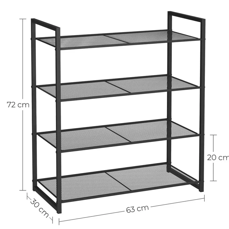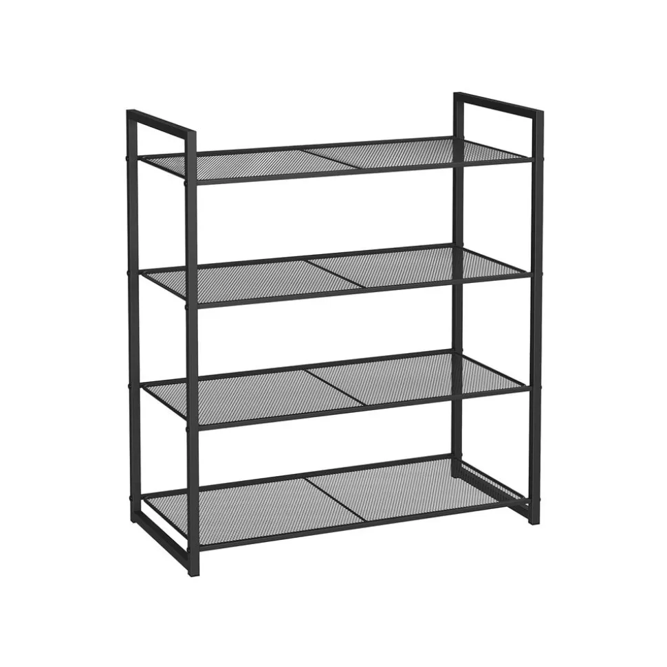 Ce que vous obtenez : Un porte-chaussures à 4 étagères avec un cadre robuste en métal. Vous pouvez l’utiliser pour ranger des chaussures dans l’entrée ou d’autres affaires dans la chambre, le dressing ou le garage