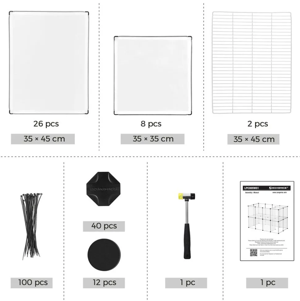 Ce que vous obtenez : Des panneaux en plastique, des raccords, des serres-cables, 12 coussinets antidérapants, 2 escaliers en maille métallique avec espacement de grille de 1,3 cm et 1 maillet en caoutchouc. Voilà de quoi faire le bonheur de vos rongeurs !