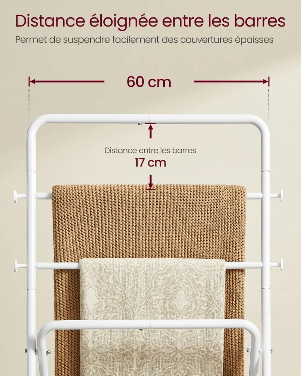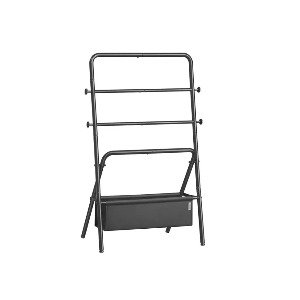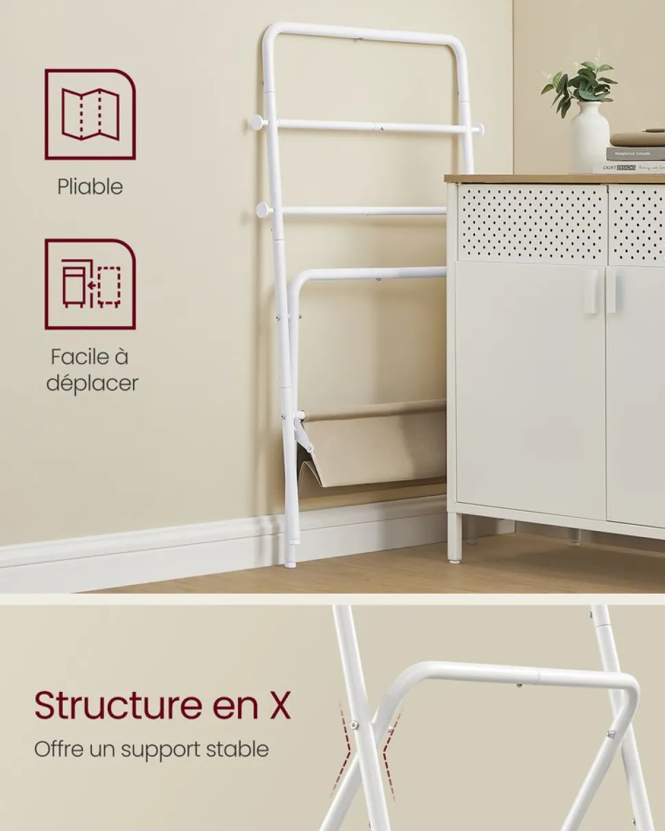 Entre de bonnes mains : Vos vêtements tombent souvent ? Optez pour ce portant ! Avec des barres en acier de 25 mm de diamètre et de 0,25 mm d’épaisseur, un tissu non-tissé de 110 g/m²et une charge de 55 kg, ce portant est stable pour vos habits