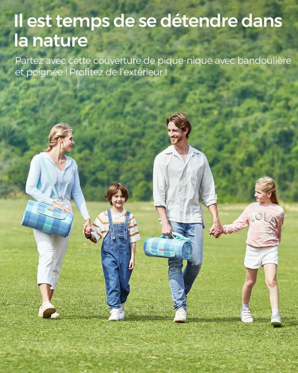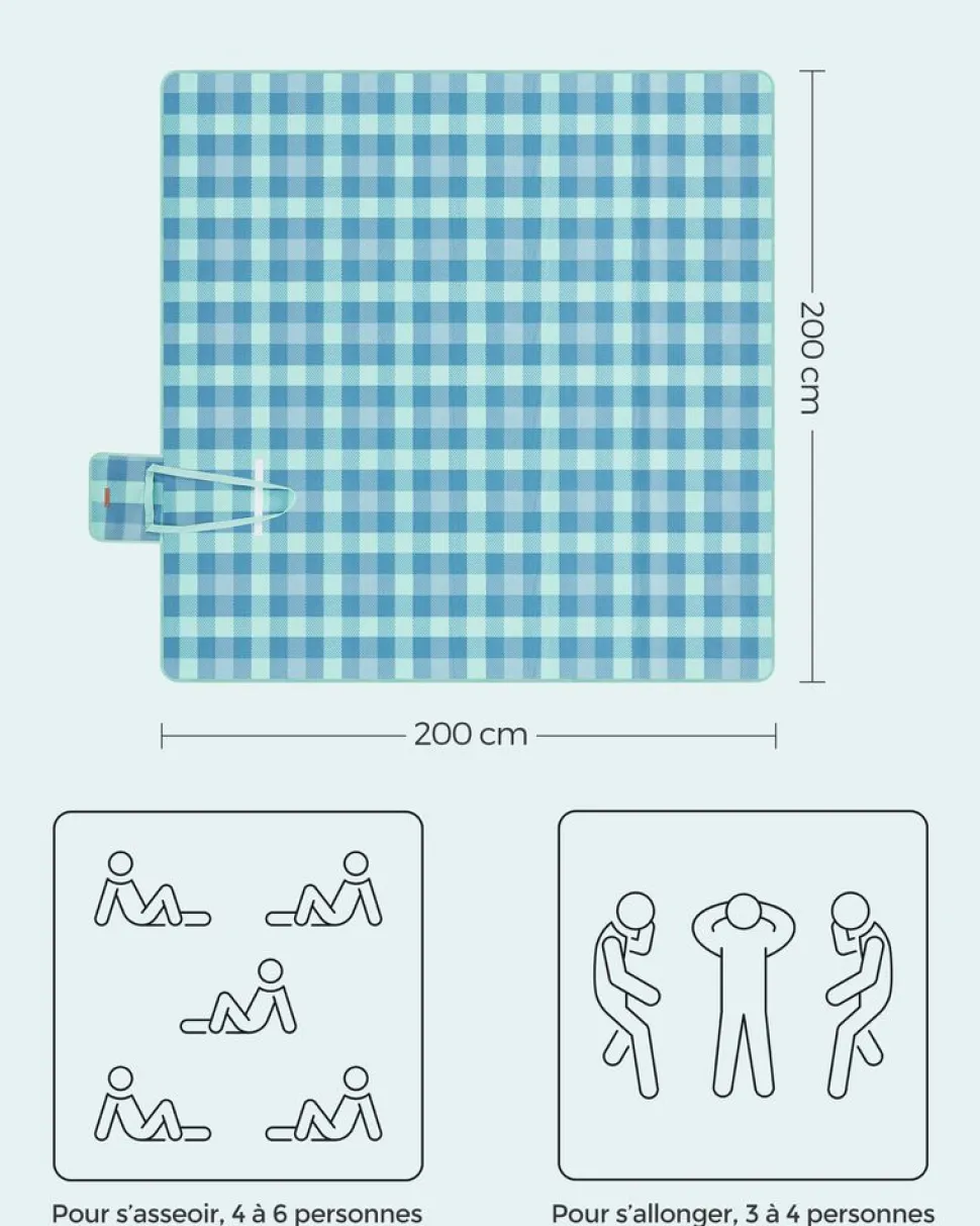 Lors d’un pique-nique, jusqu’à 4 personnes peuvent trouver une place à l’abri de l’humidité sur la grande couverture. Elle peut aussi protéger les vêtements des taches d’herbe, idéale pour la plage, le pique-nique, les voyages et la détente dans le parc. Vous pouvez emporter la couverture en randonnée ou l’utiliser comme couverture de voiture pour votre chien; afin d’éviter les poils dans la voiture.