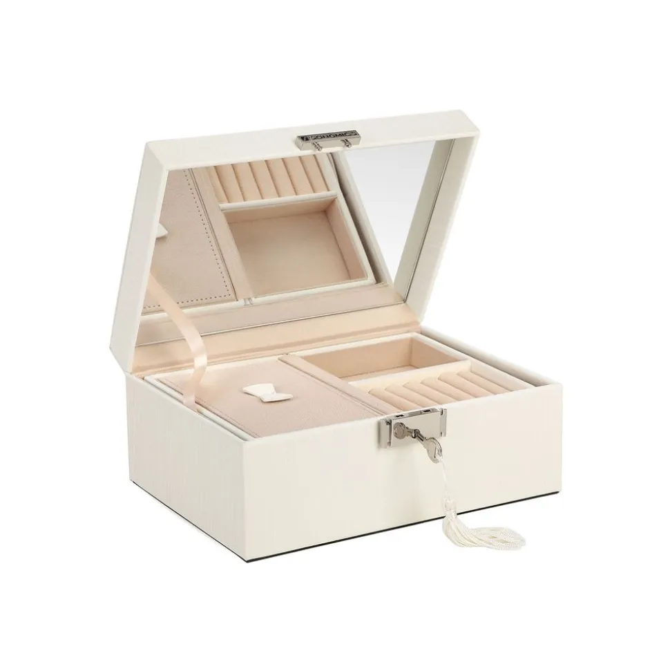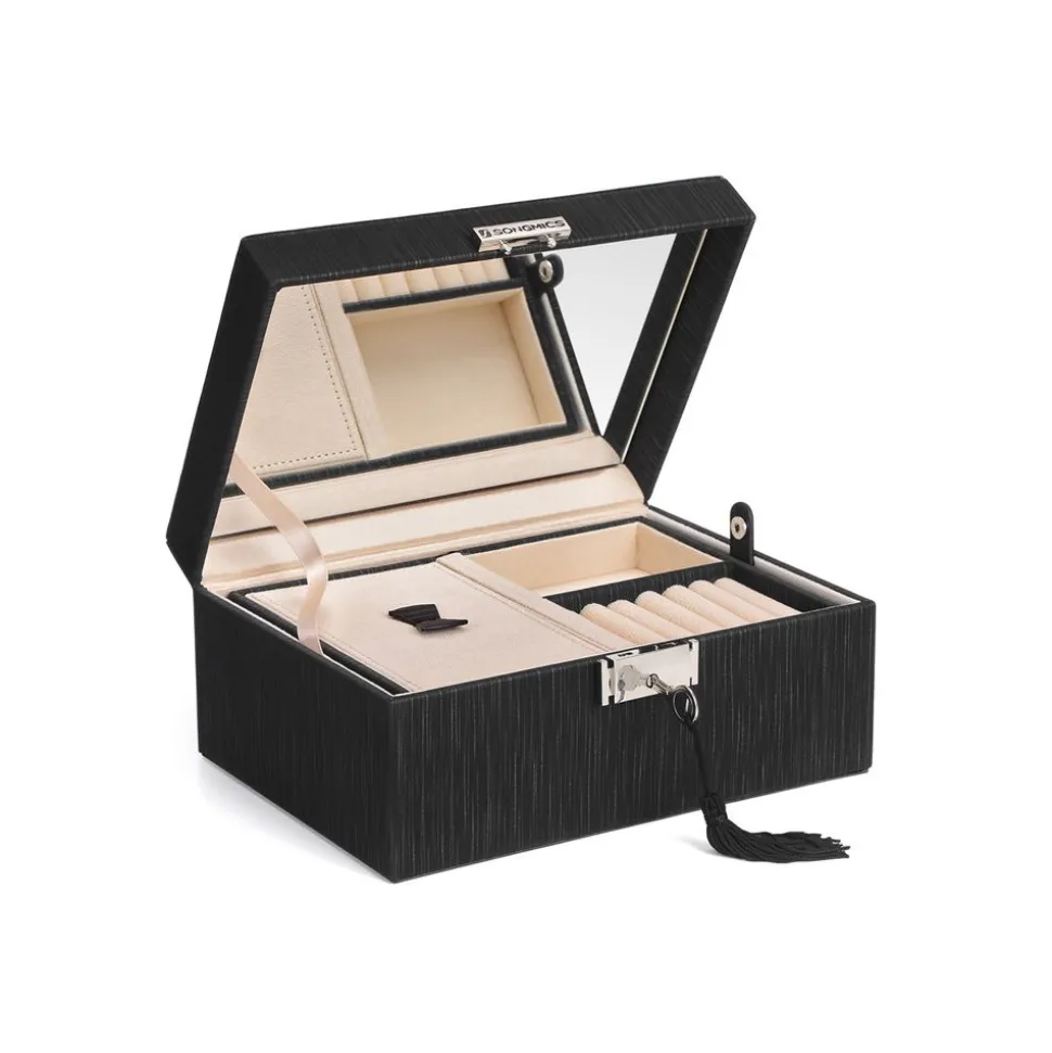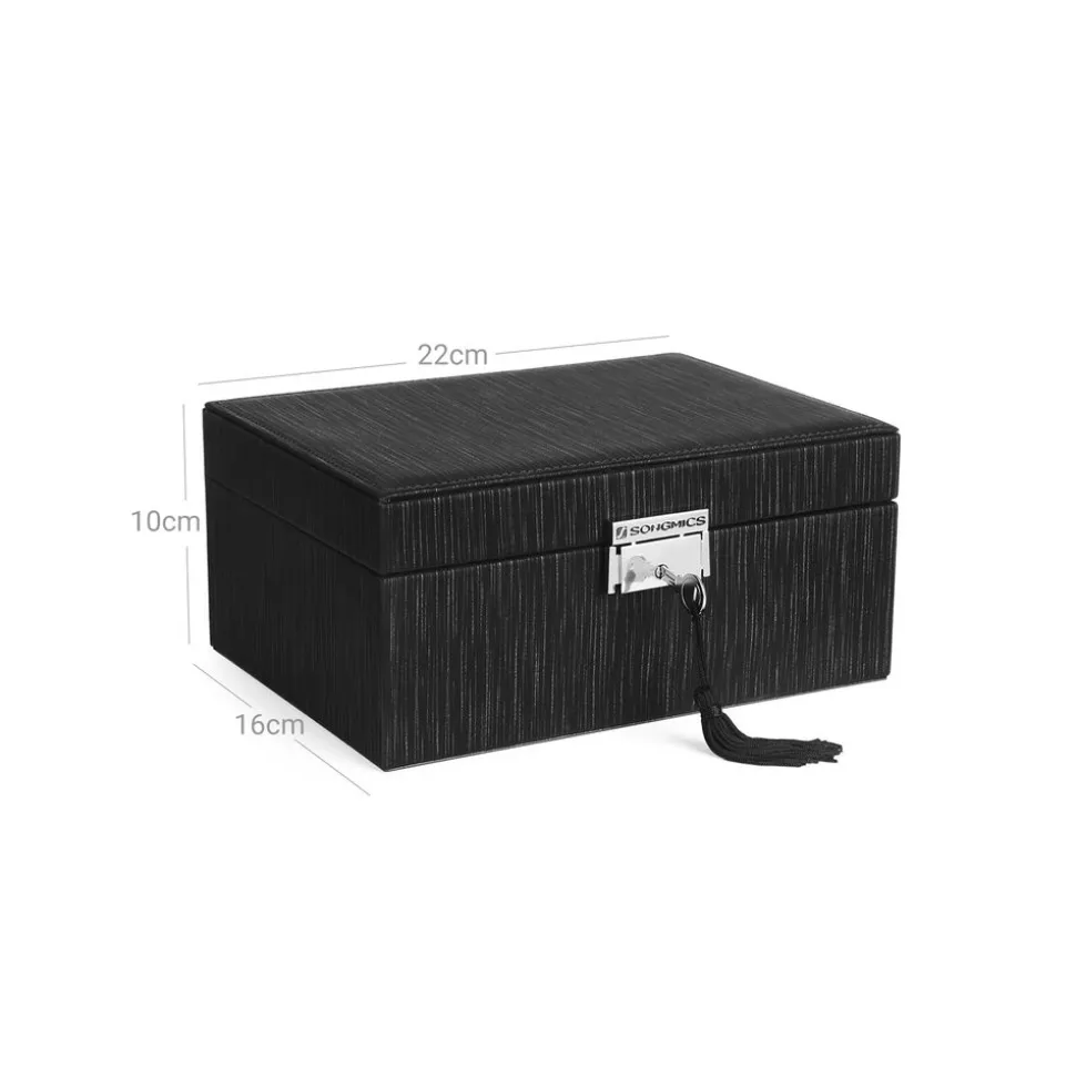 UN ESPACE SÉCURITAIRE : Ne laissez pas vos trésors s’entasser dans des tiroirs désorganisés. Offrez leur plutôt cette élégante boîte à bijoux pour bien les présenter. Cette boîte est dotée d’un fermoir en métal avec clé.
