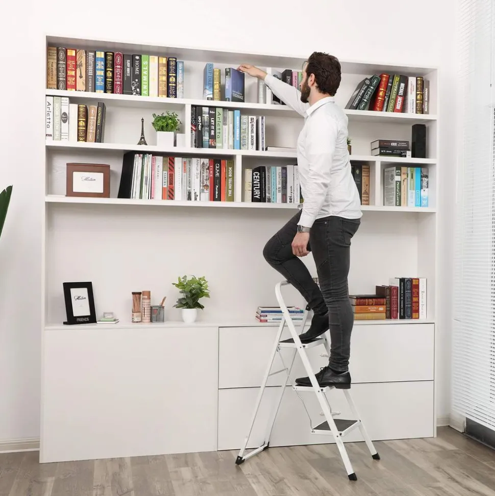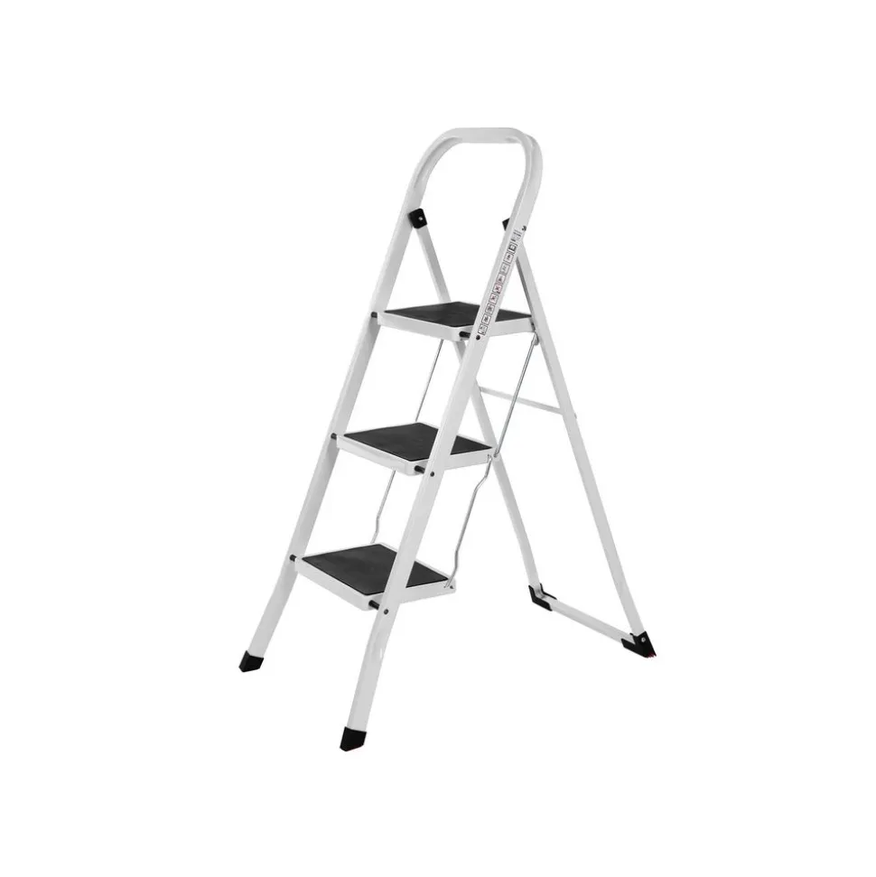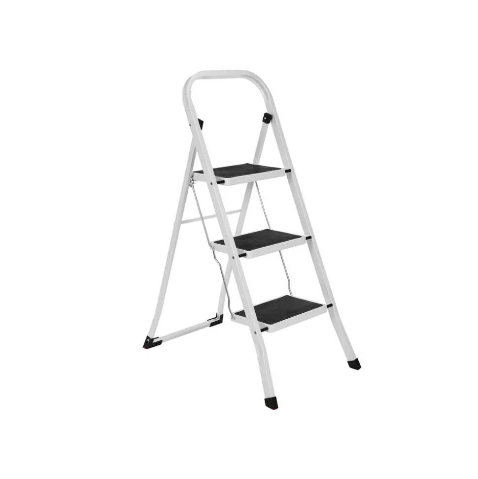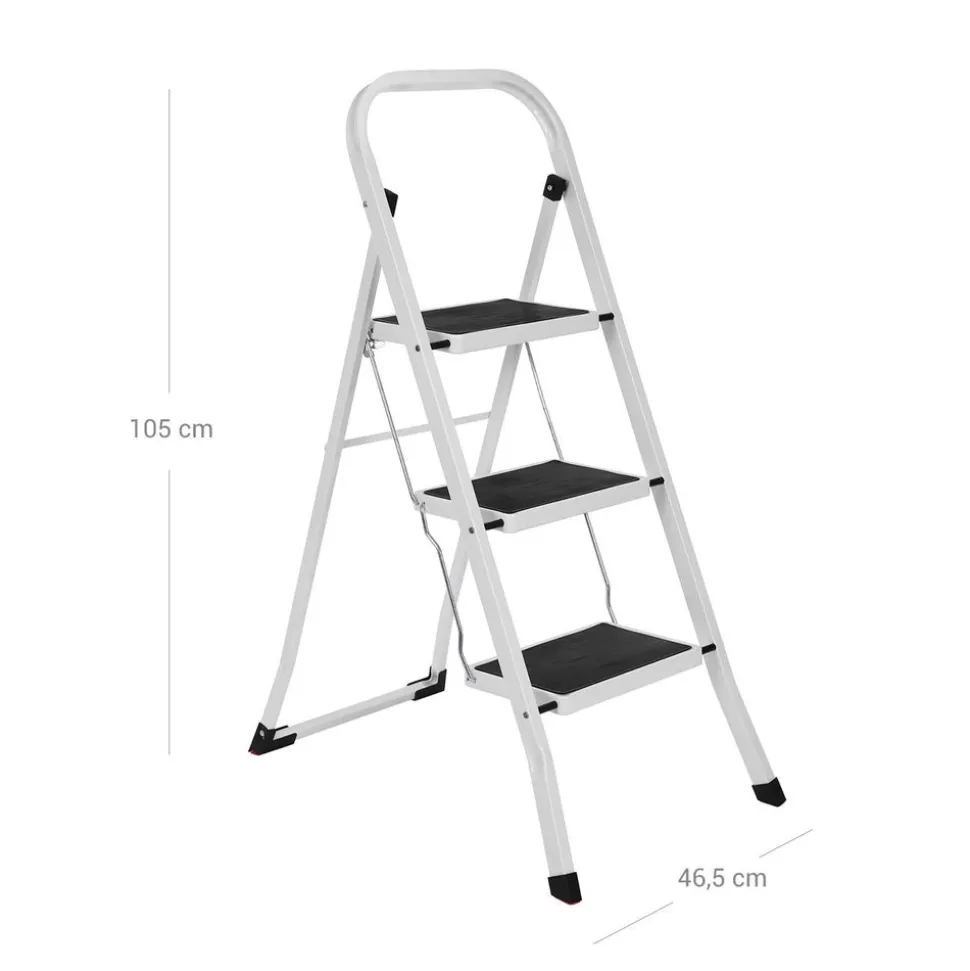 La stabilité passe avant tout – La grande surface appui (30 x 20 cm), le cadre tubulaire stable et les 4 pieds orientés vers l’extérieur de ce marchepied garantissent une excellente stabilité et évitent le basculement en charge. Verrouillage sécurisé par boutons ressorts