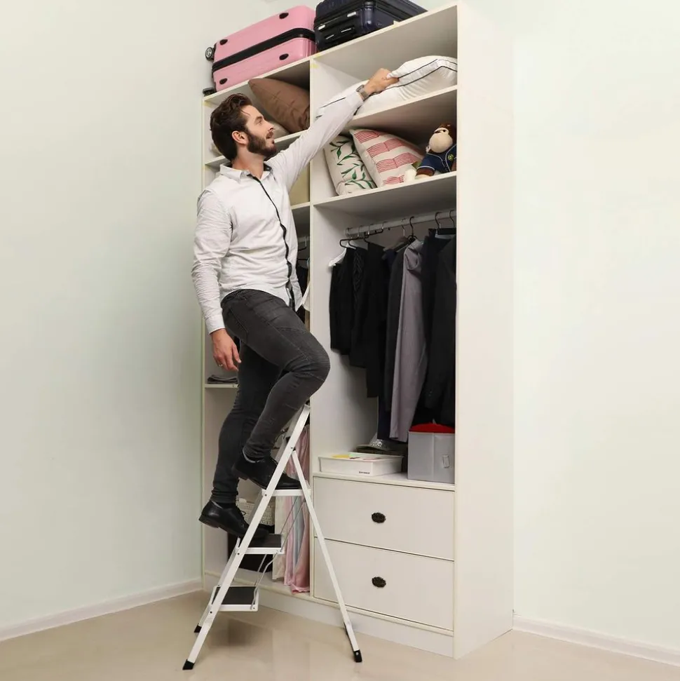 Rangement compact et transport aisé – Plié, il ne mesure que 3,5 cm d’épaisseur. Il peut être entreposé dans les coins ou les interstices entre les murs et les armoires. Grâce à sa poignée, le marchepied (3,5 kg) est très pratique à transporter